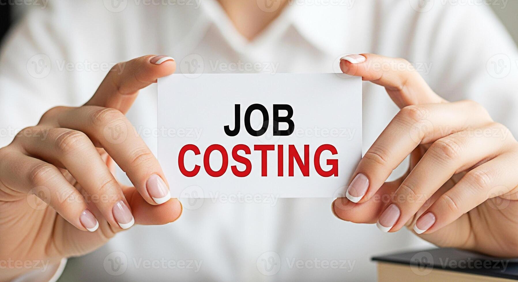 Closeup of manicured hands holding a card with Job Costing text in a bright office setting emphasizing financial accounting and project management with a focus on cost analysis and business efficiency Pro Photo