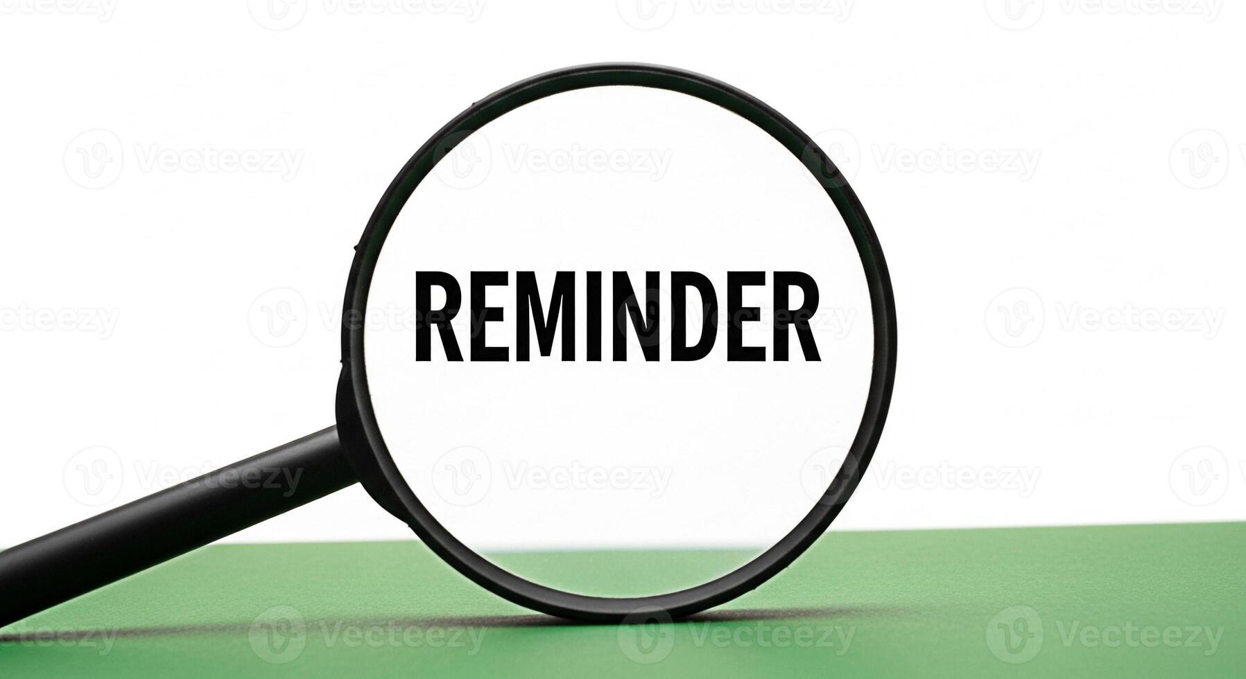 Magnifying glass focusing on the word Reminder on a green surface symbolizing the importance of remembering tasks and deadlines creating a sense of urgency and attention to detail in a minimalist sett Pro Photo