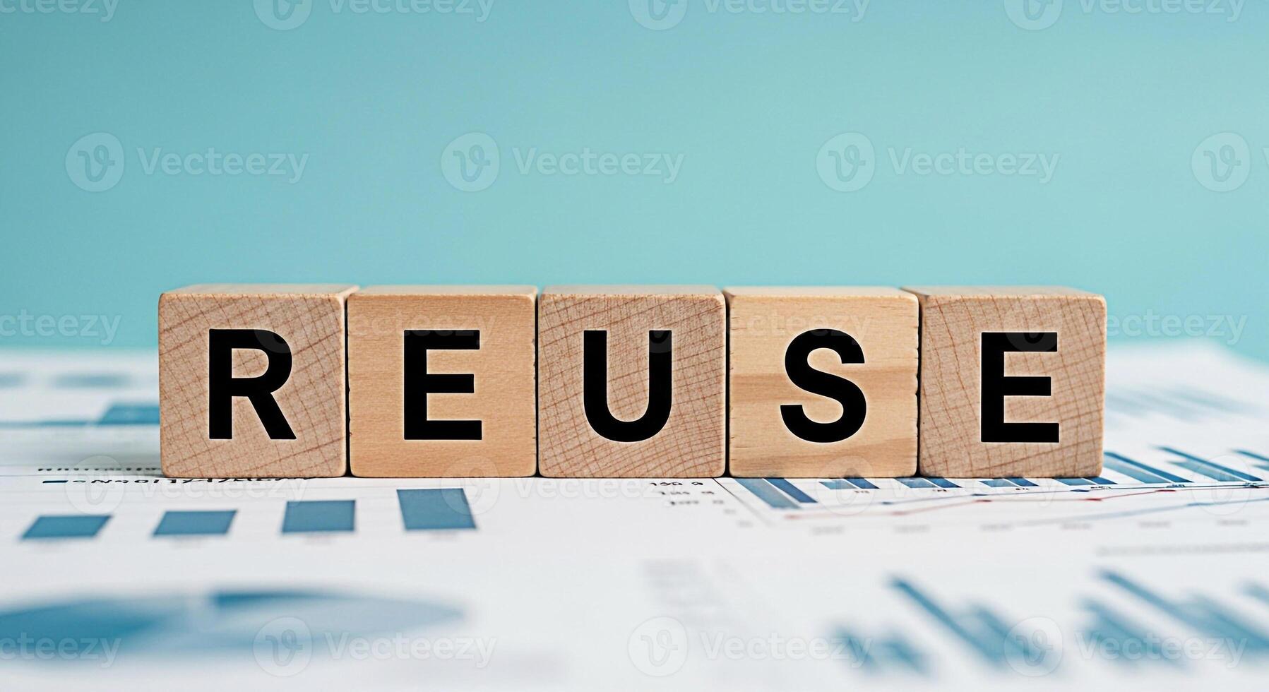 Wooden blocks spelling REUSE on top of financial charts in a bright studio setting symbolizing sustainability and conscious consumption for a greener future and responsible business practices Pro Photo