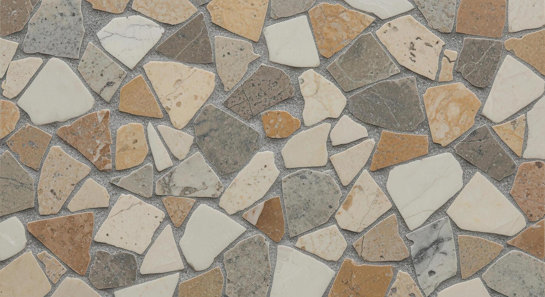 Abstract mosaic tile texture background, featuring a variety of irregular stone shapes and earthy tones, suitable for seamless surface design or pattern usage photo
