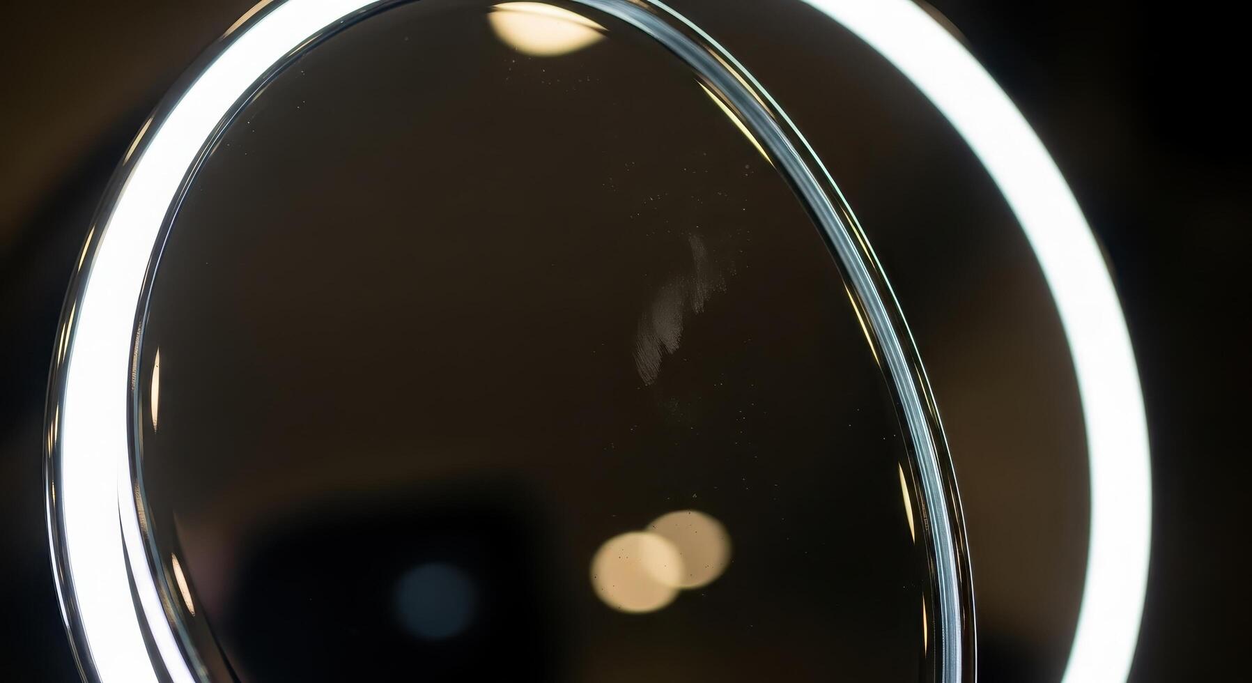 Close-up view of a modern illuminated mirror with a reflective surface, featuring a circular design and a clean aesthetic for personal care photo