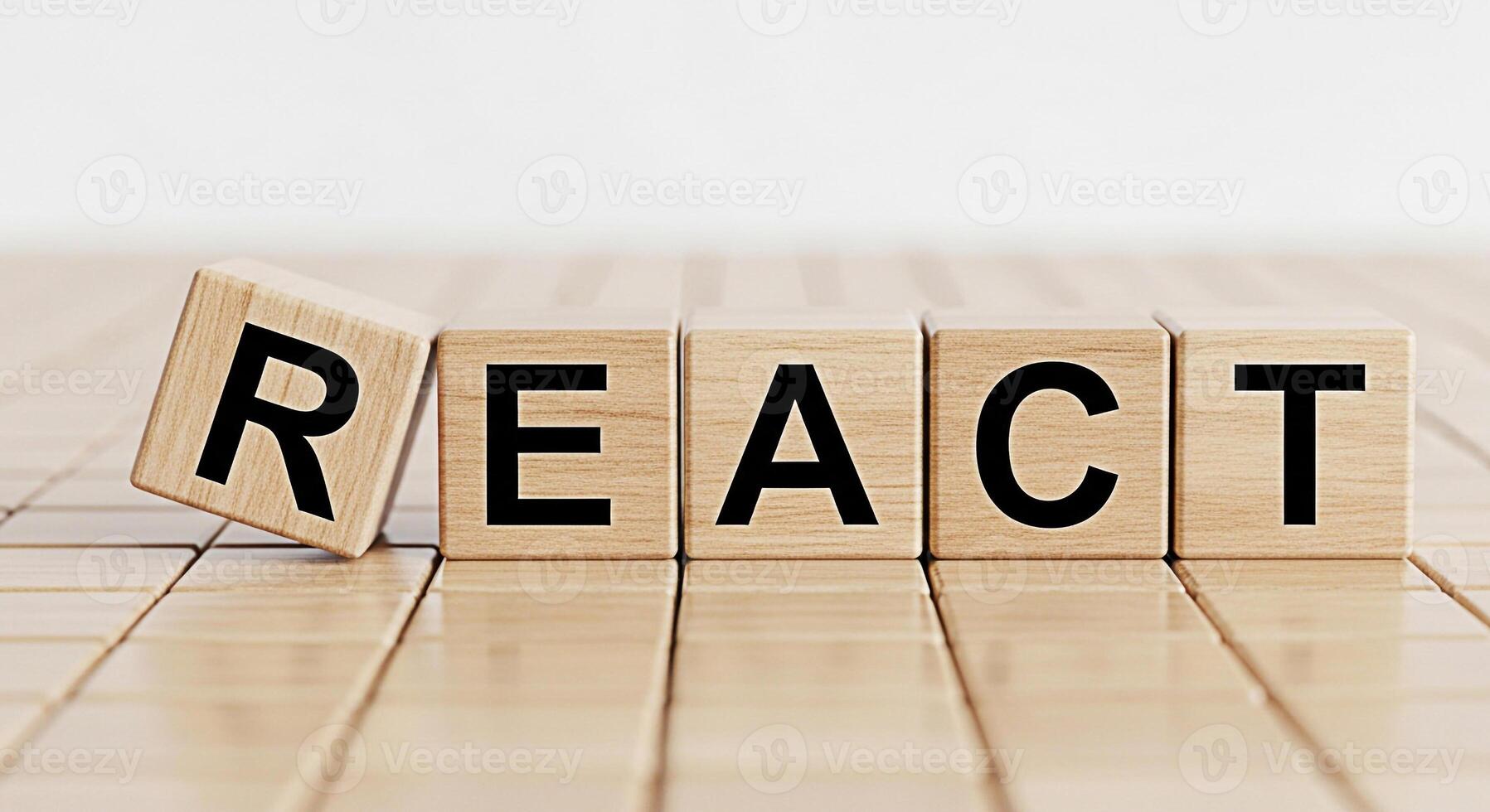 Wooden blocks spelling REACT on a wooden surface symbolizing a dynamic and responsive approach to problemsolving and innovation in a bright and minimalist setting conveying a sense of creativity and a Pro Photo