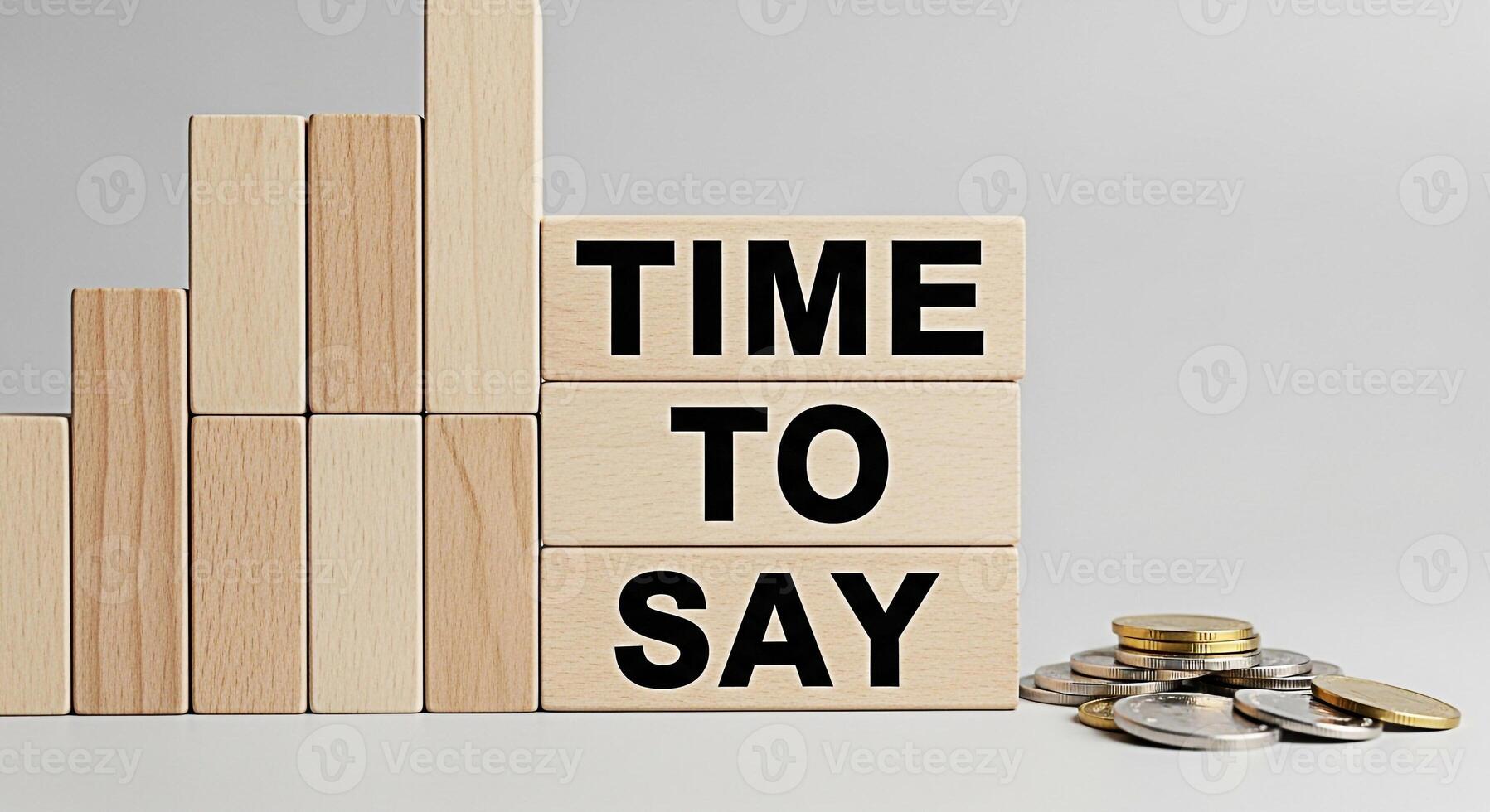 Wooden blocks displaying the phrase Time to Say next to a rising bar graph made of blocks and a pile of coins on a white surface symbolizing financial communication and the importance of speaking up a Pro Photo