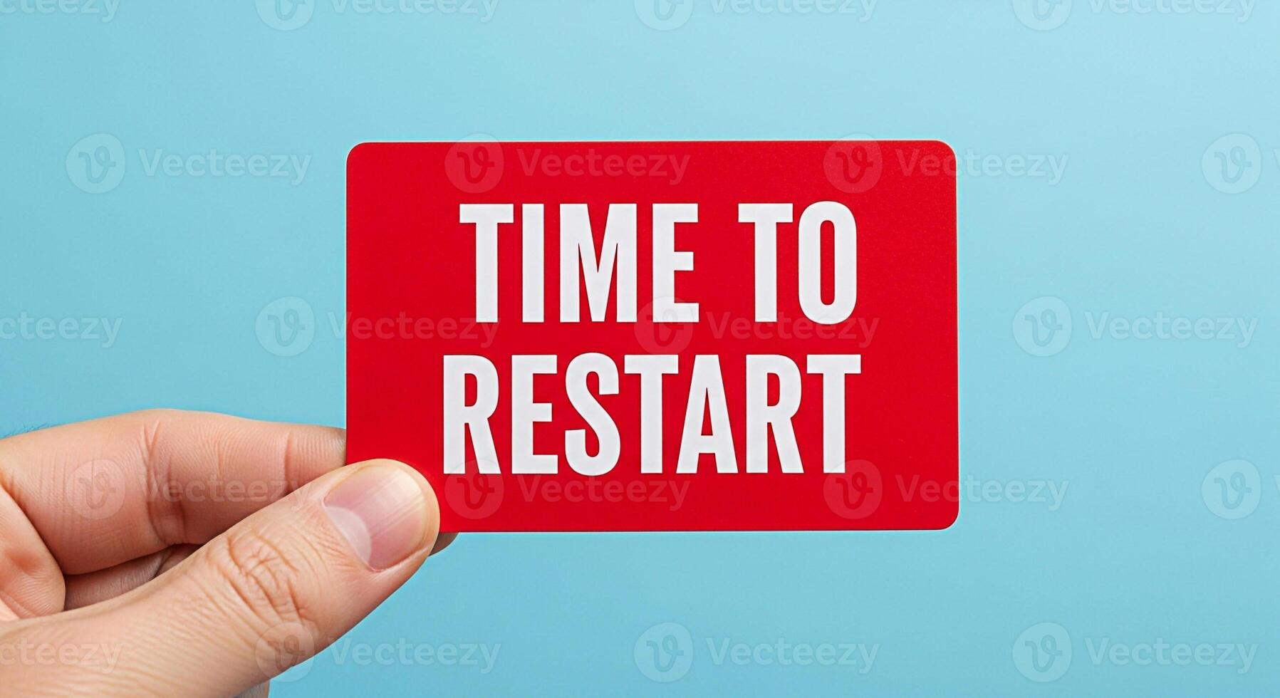 Hand holding a red card with the message Time to Restart against a light blue background symbolizing the need for a fresh start renewal and the concept of overcoming challenges with resilience Pro Photo