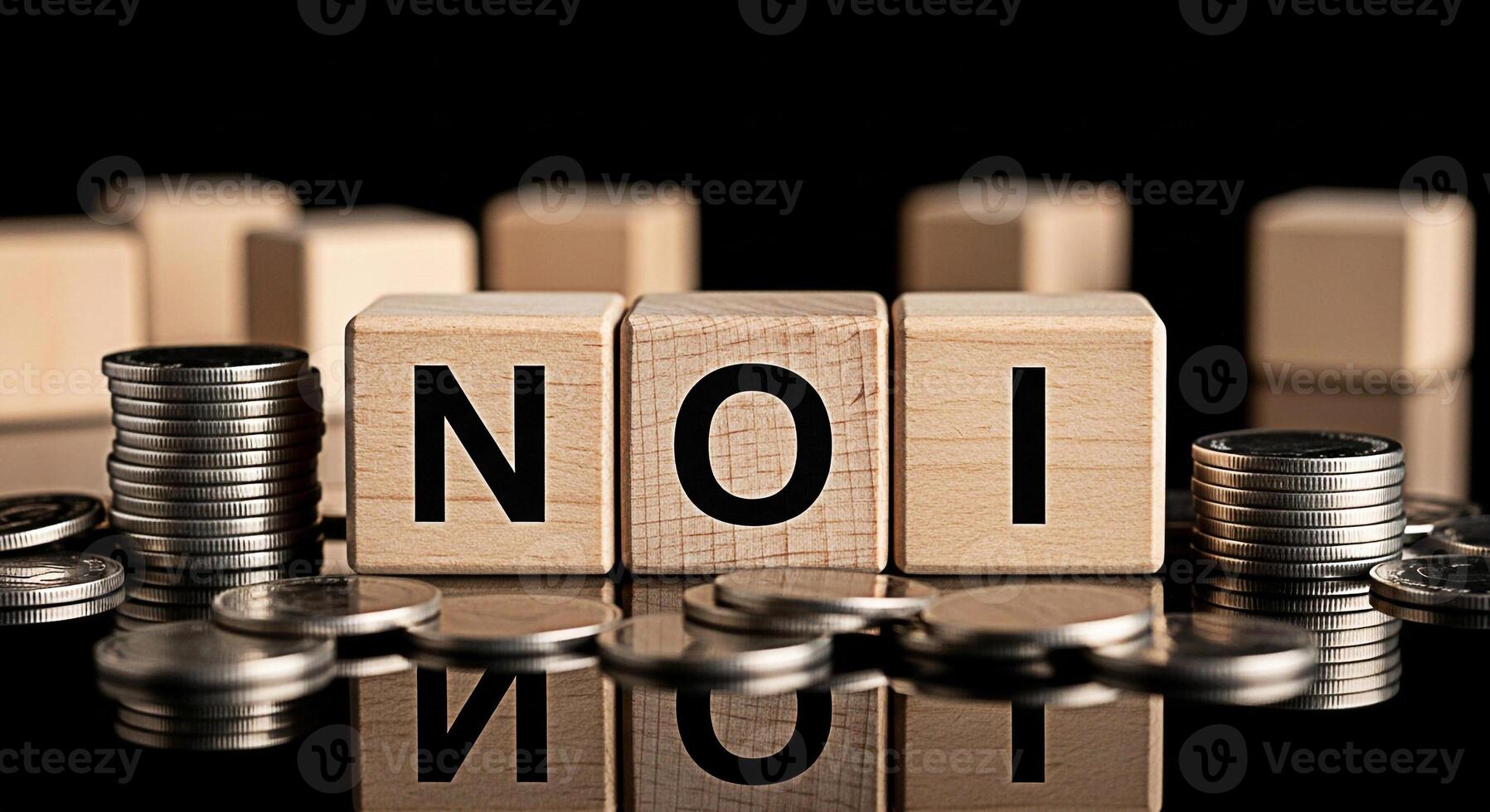 Wooden blocks spelling NOI surrounded by stacks of coins on a reflective surface representing Net Operating Income in a financial and investment context conveying growth and profitability Pro Photo