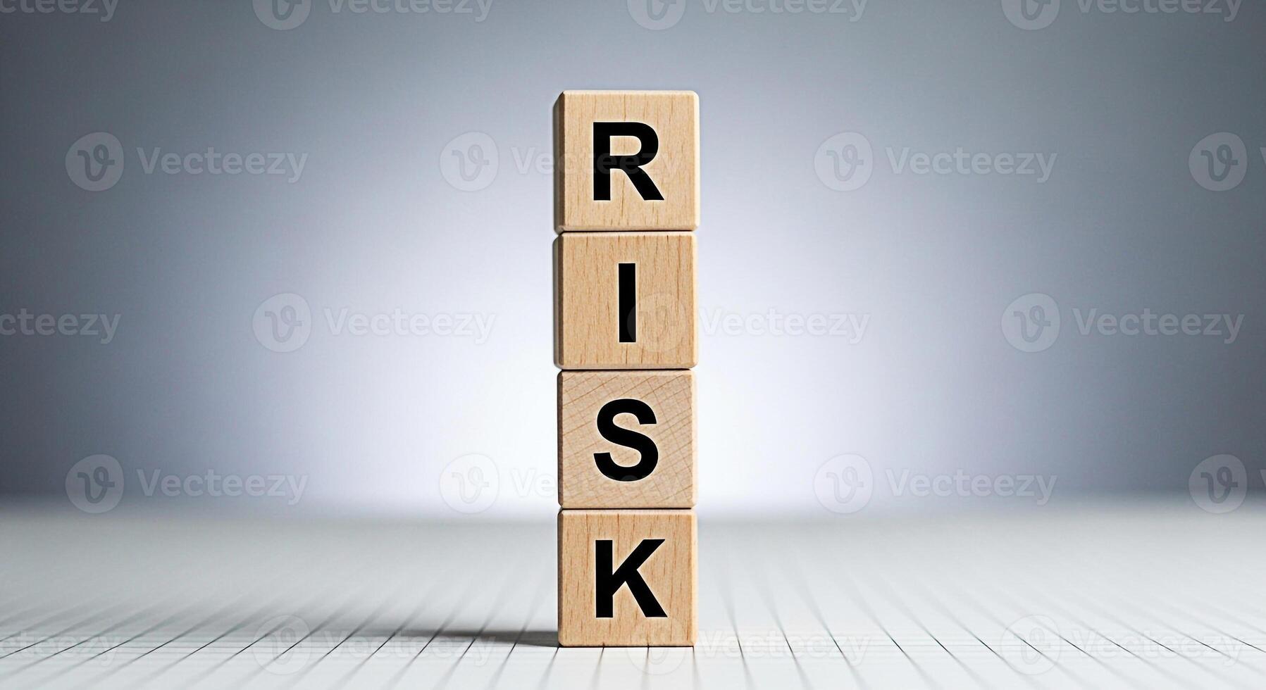 Stacked wooden blocks spelling RISK on a white grid surface representing business challenges and financial uncertainty in a minimalist and conceptual studio setting conveying a sense of calculated dec Pro Photo