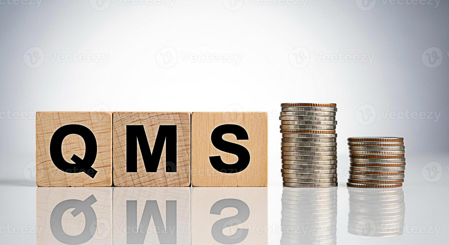 Wooden blocks spelling QMS next to stacks of coins on a reflective surface representing Quality Management System implementation and financial investment in a structured business environment conveying Pro Photo