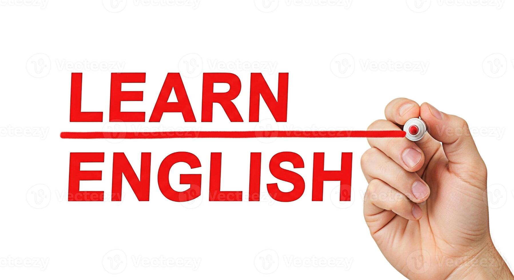A hand underlines the words Learn English in red marker on a white background symbolizing the importance of education and language acquisition for global communication and personal development in a mo Pro Photo