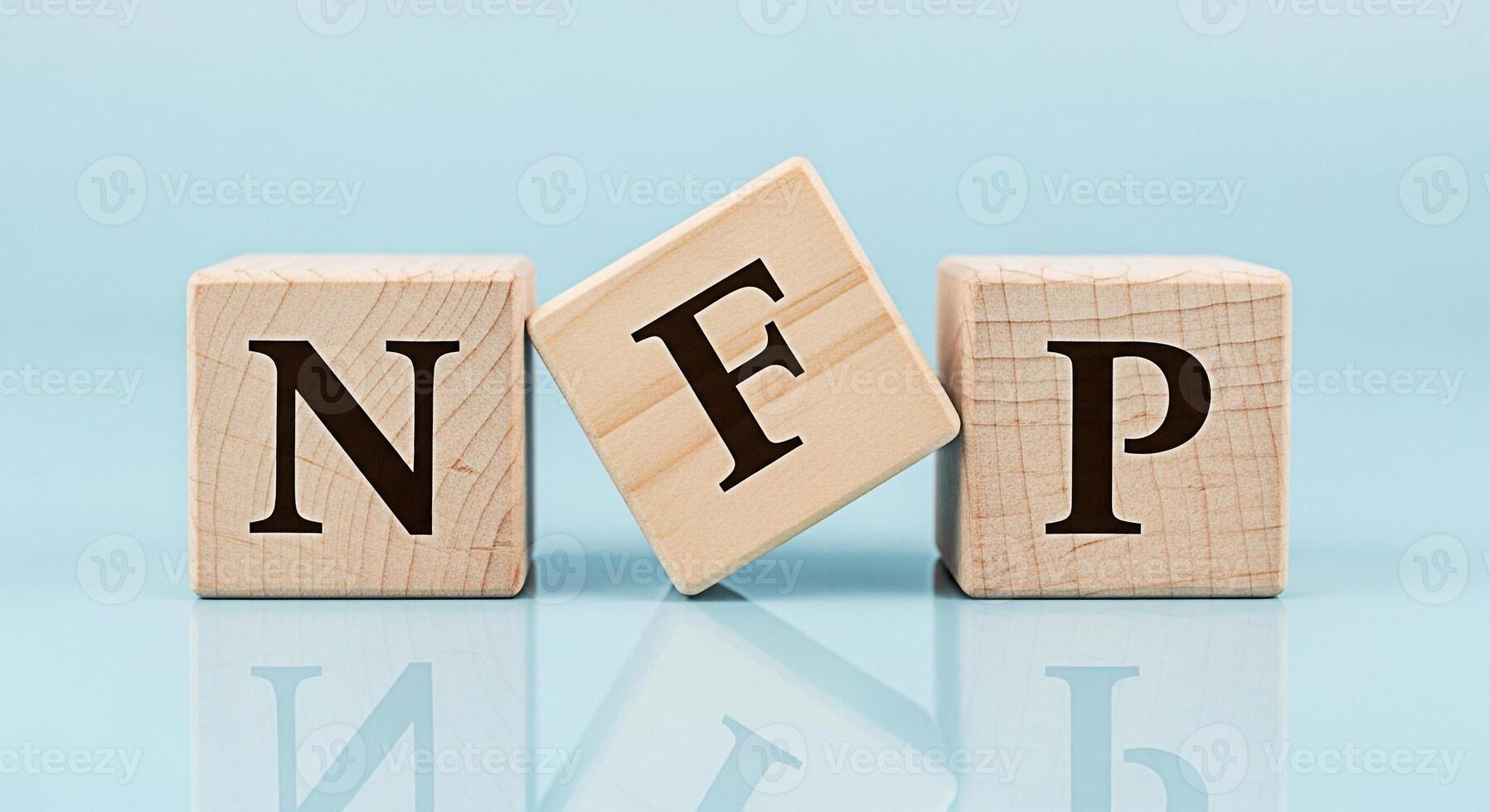 Wooden blocks displaying NFP on a reflective surface against a light blue backdrop representing NonFarm Payrolls data and economic indicators symbolizing financial analysis and market trends with a cl Pro Photo