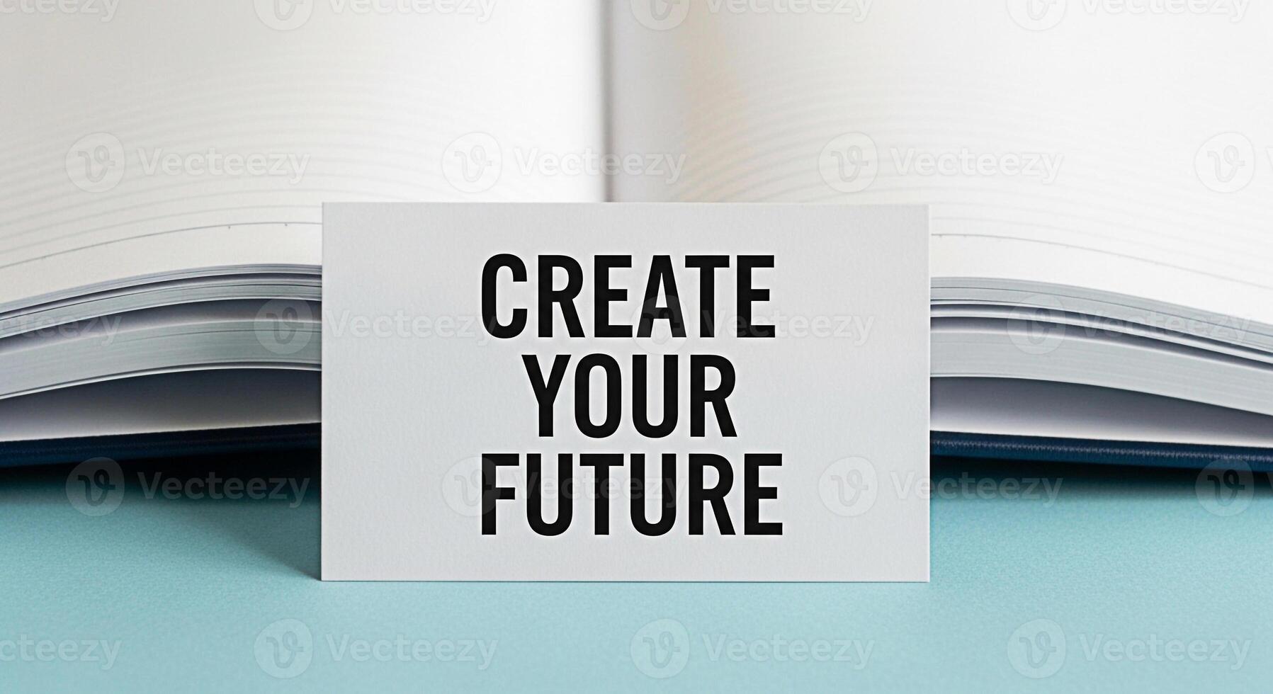Inspirational message Create Your Future displayed on a business card placed in front of an open notebook on a light blue surface symbolizing planning ambition and the power of positive thinking for s Pro Photo