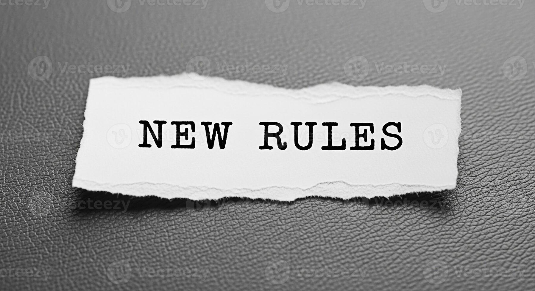 Torn paper slip displaying New Rules on a textured gray surface symbolizing change and adaptation in a business environment conveying a message of innovation and strategic shift Pro Photo