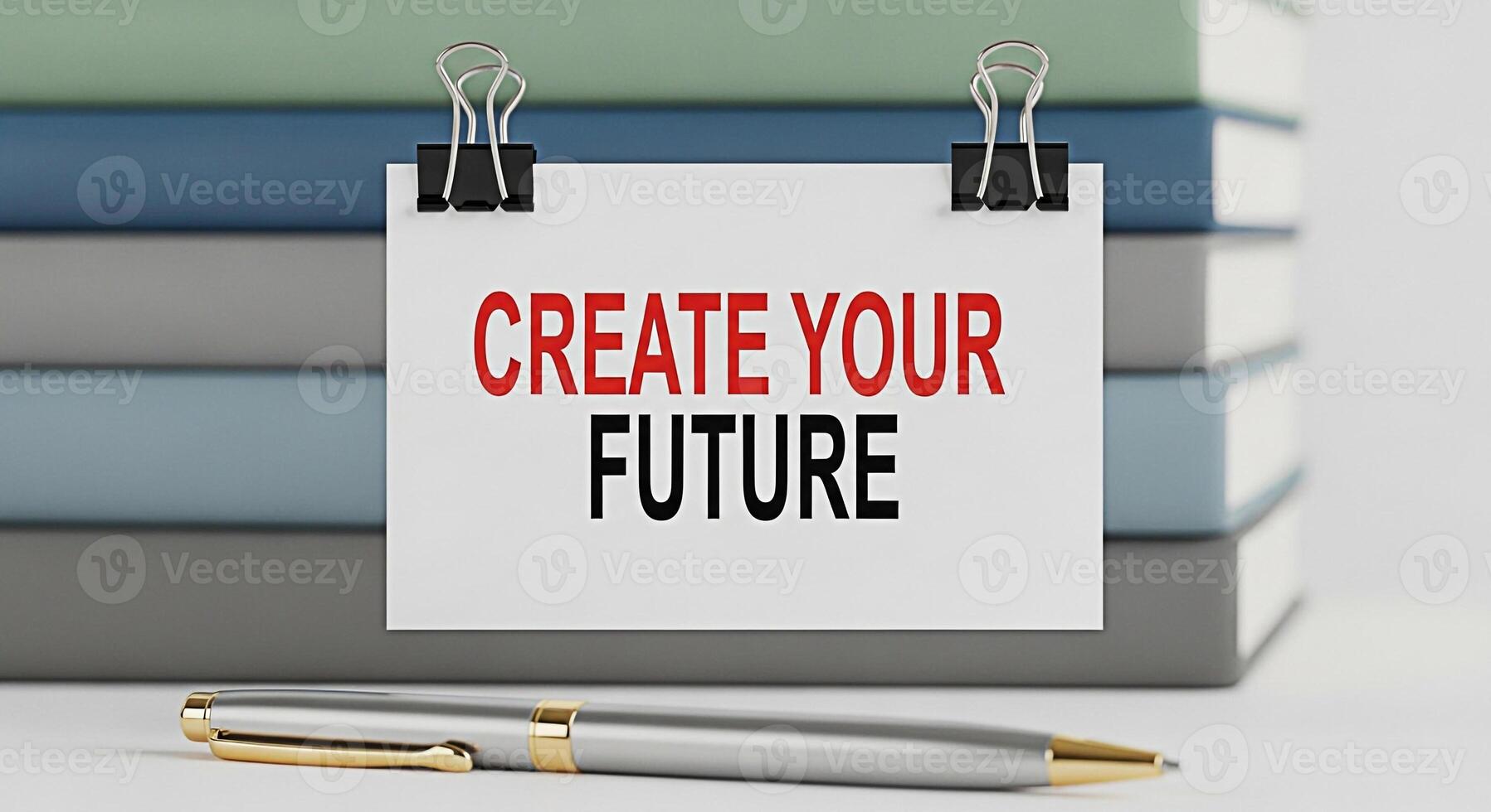 Inspirational message Create Your Future displayed on a white card with binder clips resting against a stack of books with a pen in the foreground symbolizing motivation and planning for success Pro Photo