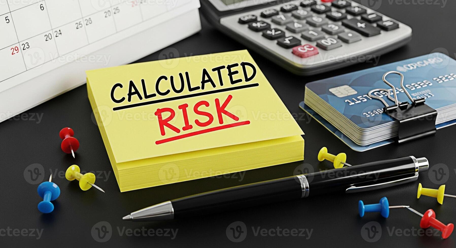 Closeup of a stack of yellow sticky notes displaying Calculated Risk on a dark desk with a pen calculator credit cards and calendar symbolizing financial planning and strategic decisionmaking in busin Pro Photo
