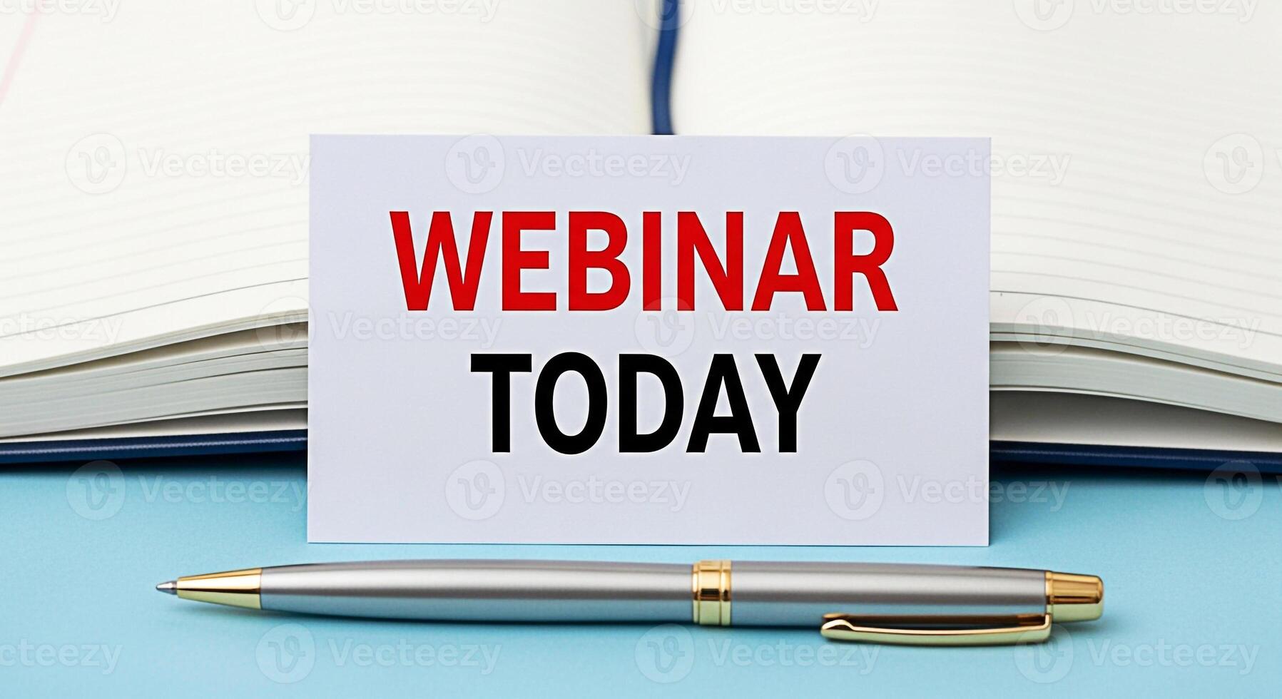 Informative card announcing a webinar today positioned on a light blue surface with an open notebook in the background creating a sense of urgency and importance for online learning and professional d Pro Photo