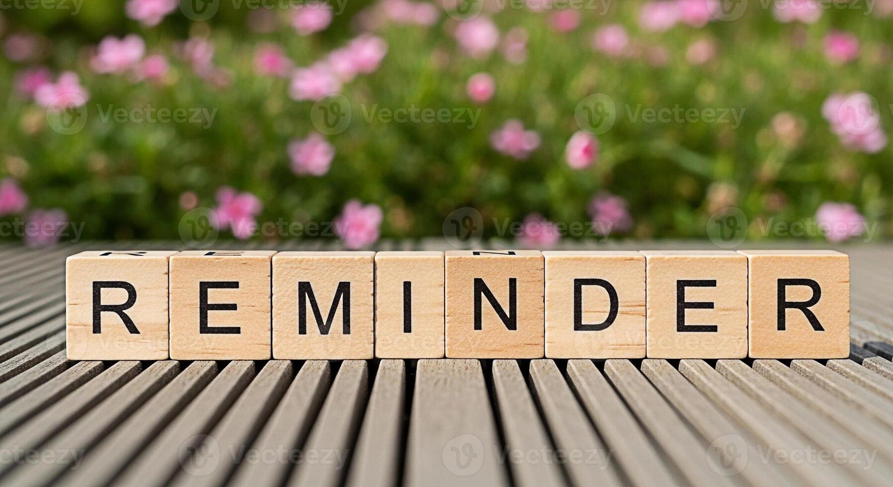Wooden blocks spelling REMINDER placed on a wooden surface with a blurred background of pink flowers and green foliage creating a gentle and encouraging atmosphere for important tasks and deadlines Pro Photo