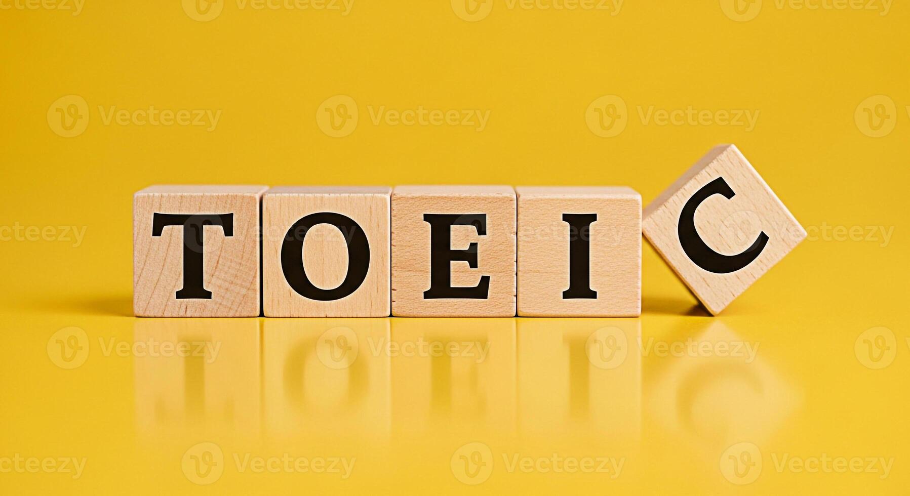 Wooden blocks spelling out TOEIC on a vibrant yellow background symbolizing preparation and success in the international English language test creating a focused and motivational atmosphere for learni Pro Photo