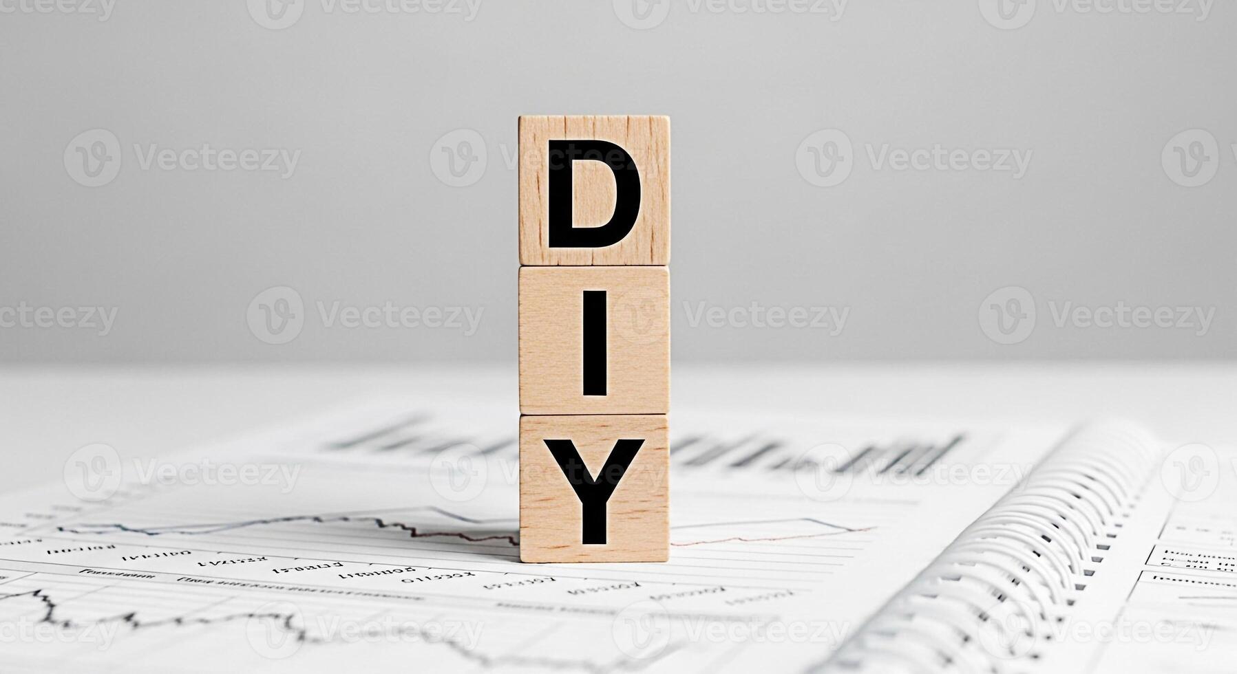 Wooden blocks spelling DIY on a financial report in a bright studio setting symbolizing creative problemsolving selfreliance and the empowering feeling of taking control of your own projects and finan Pro Photo