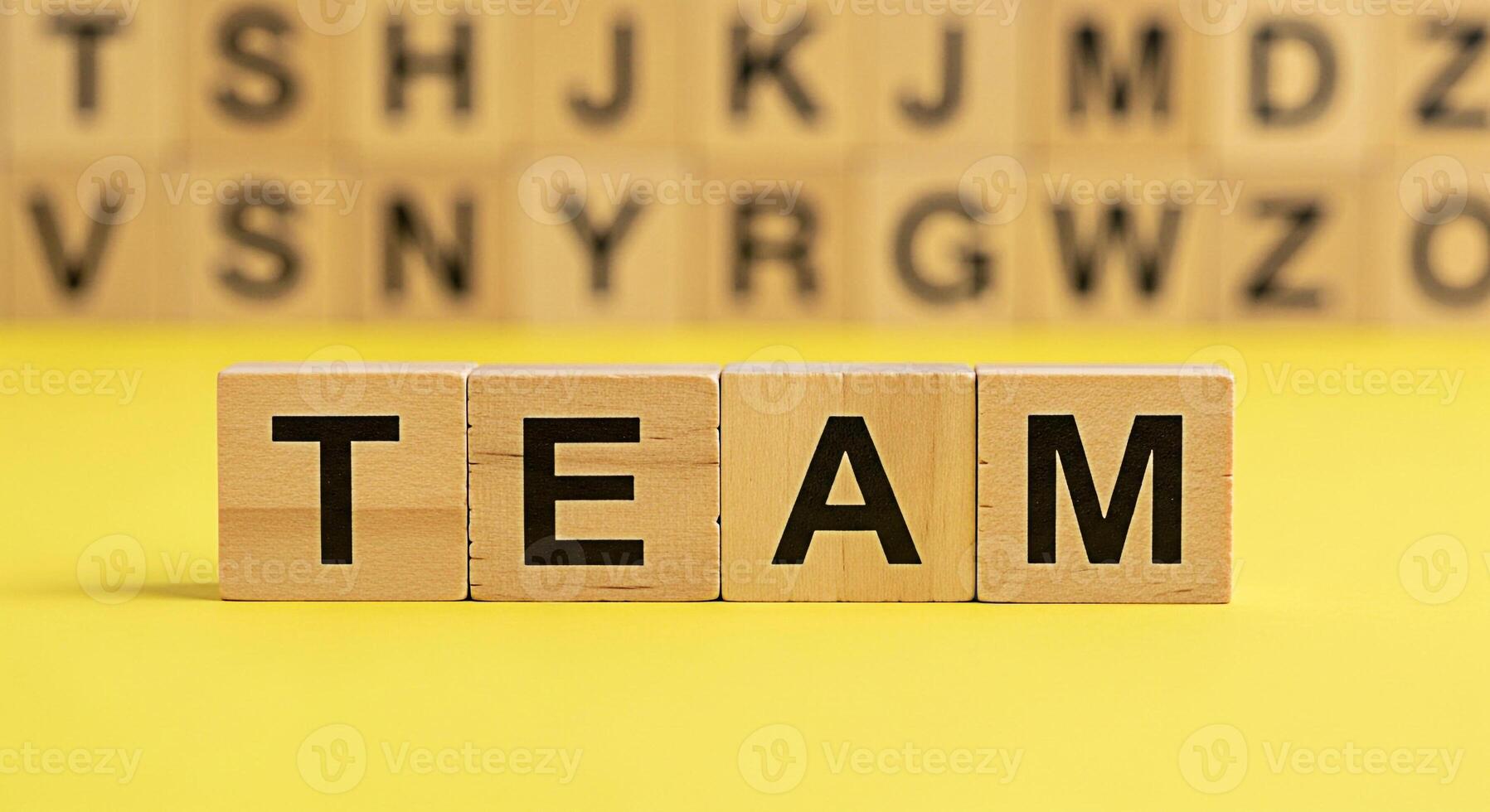 Wooden blocks spelling out TEAM on a bright yellow surface with blurred alphabet blocks in the background symbolizing collaboration unity and the power of teamwork in achieving common goals Pro Photo