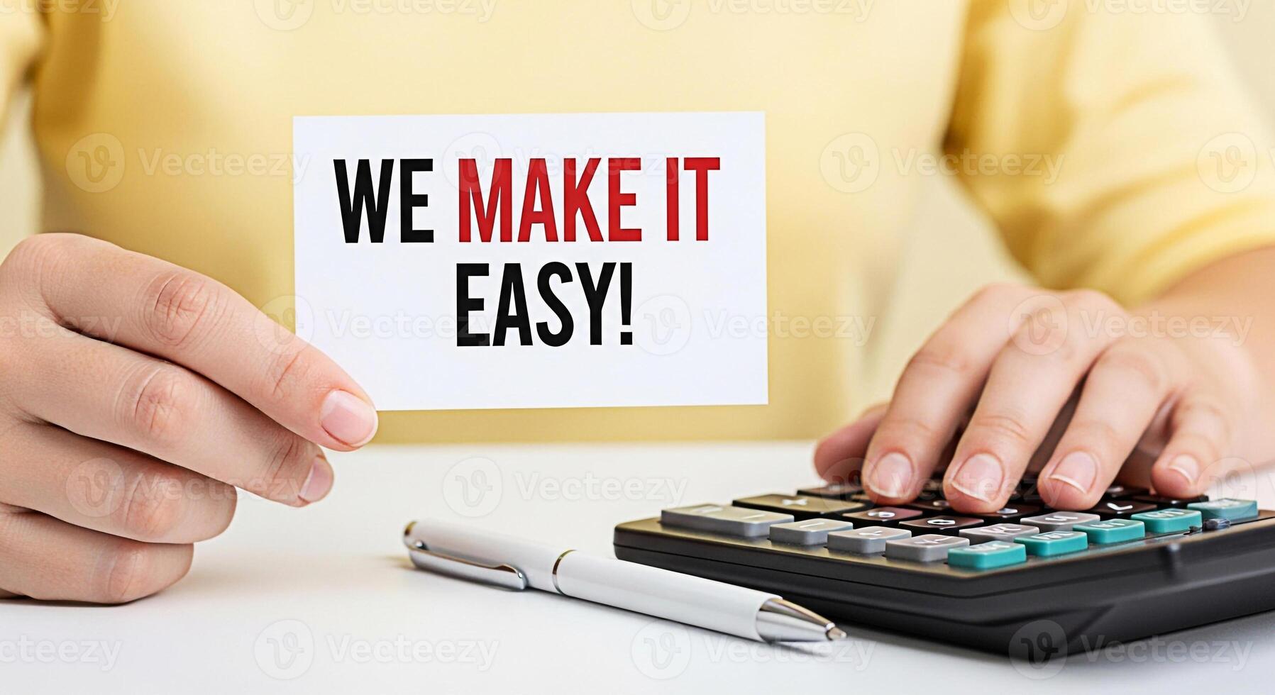 Closeup of hands using a calculator on a white desk while holding a card that reads We Make It Easy conveying a message of simplicity and ease in financial management and business solutions Pro Photo