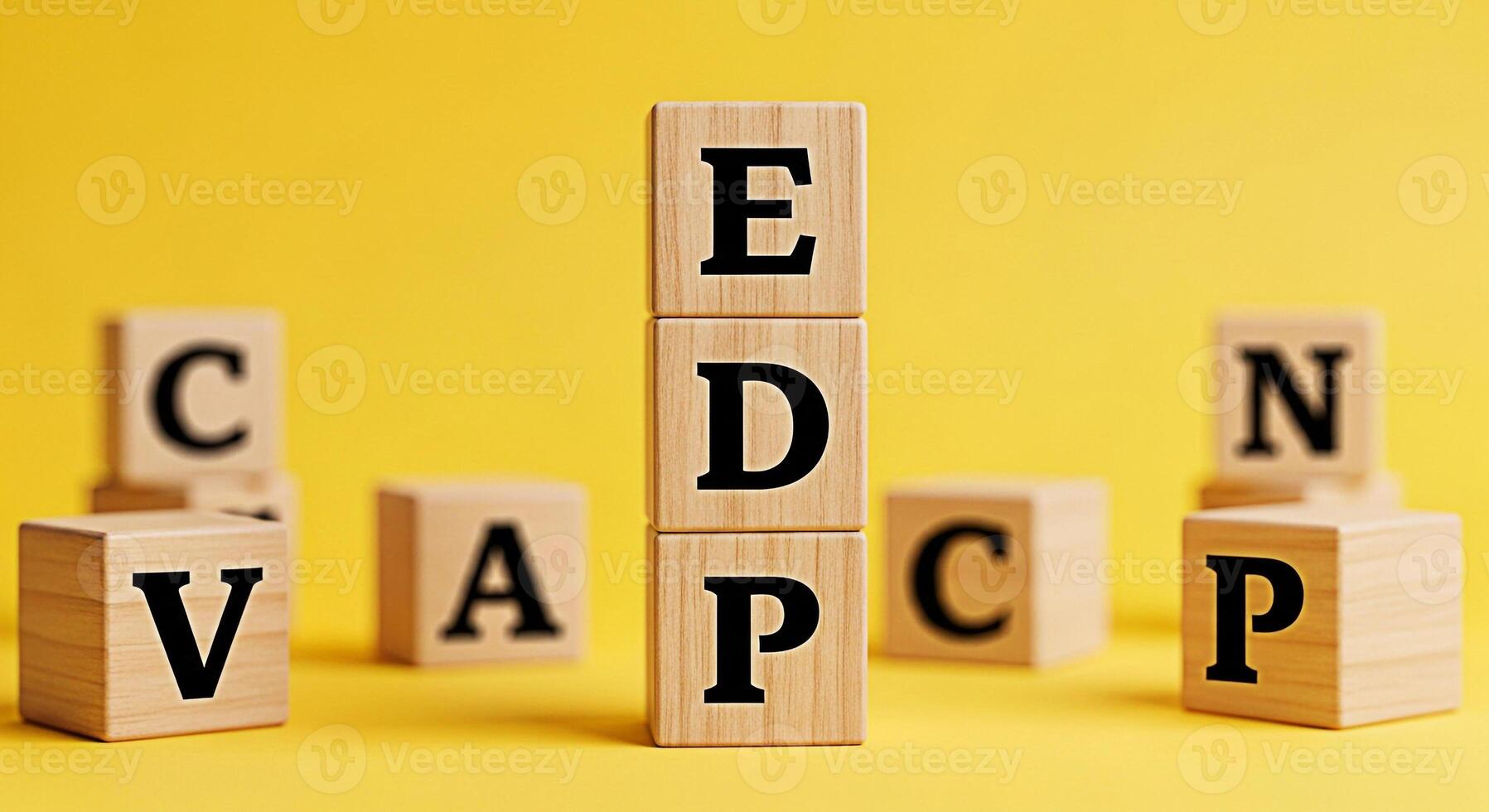 Wooden blocks displaying the letters of EDP VAC and NCP on a bright yellow background representing data processing and analysis conveying a sense of organization precision and the importance of inform Pro Photo