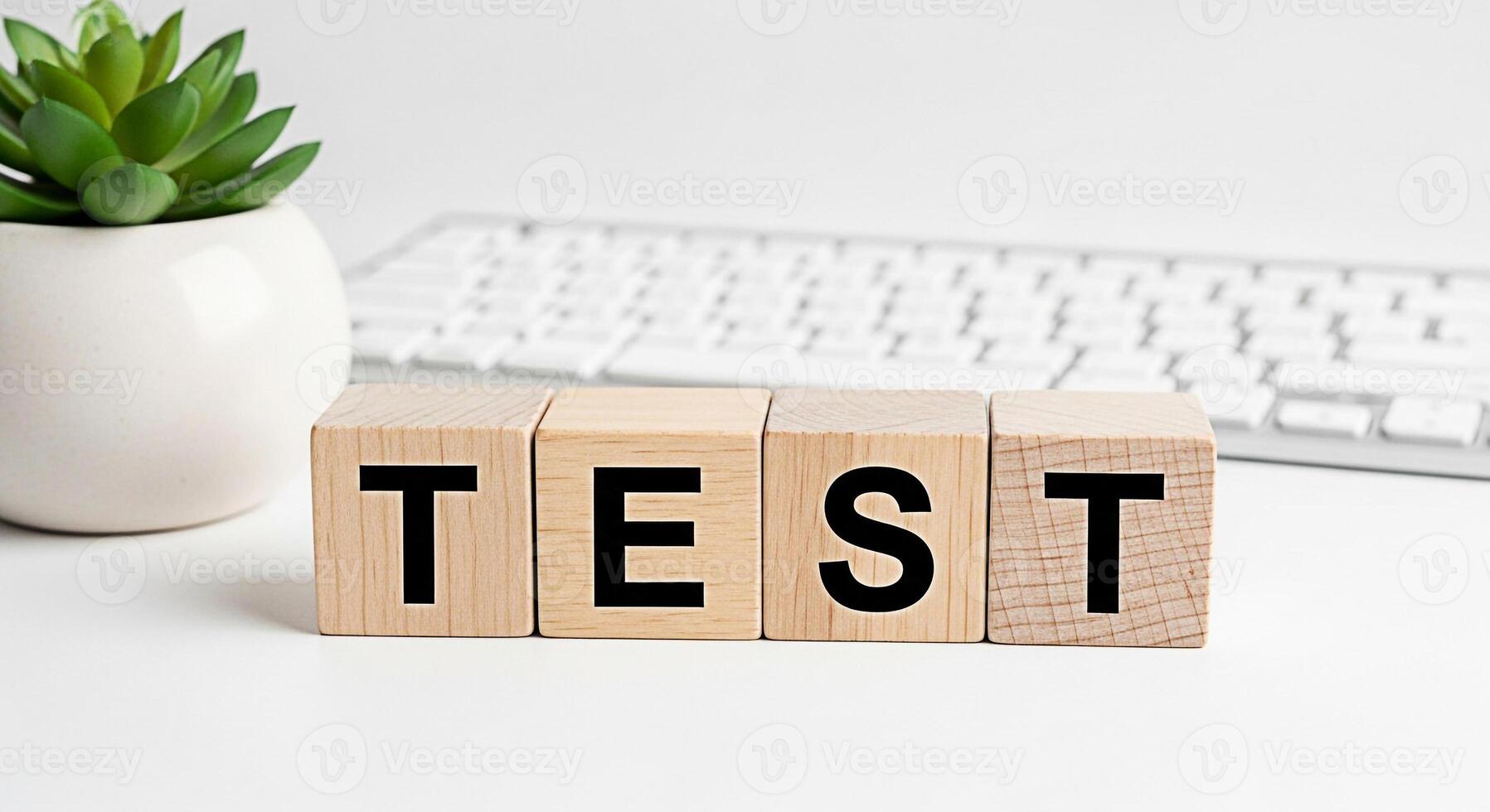 Wooden blocks spelling TEST on a white desk next to a succulent and keyboard representing assessment evaluation and the importance of quality control in a modern office environment Pro Photo