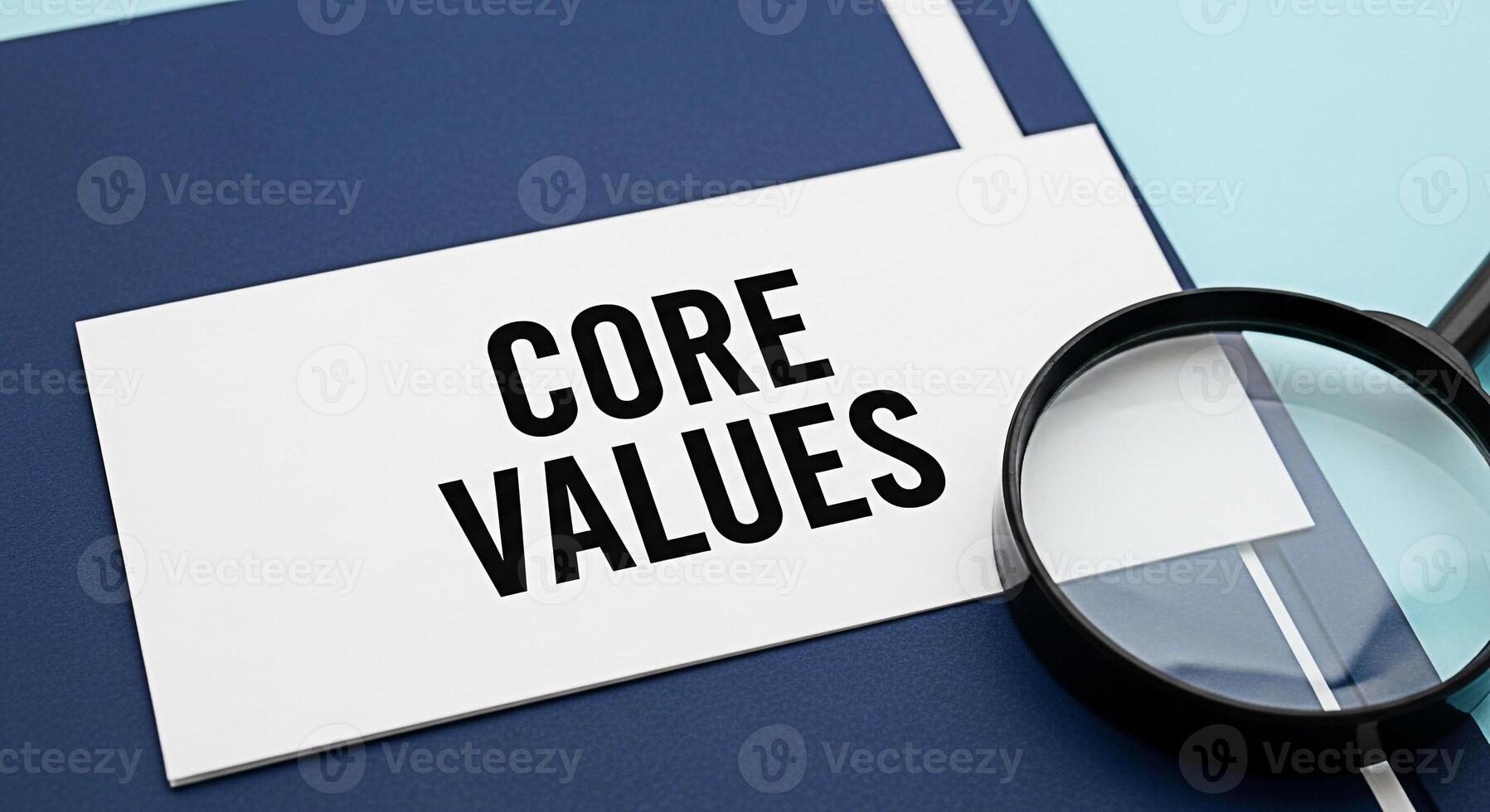 Magnifying glass examining a card with the words Core Values on a blue background emphasizing the importance of ethics principles and integrity in business and personal life creating a sense of focus Pro Photo