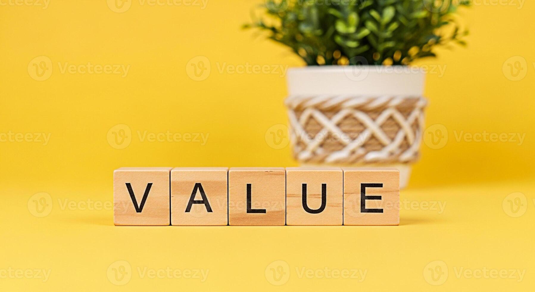 Wooden blocks spelling VALUE displayed on a bright yellow surface symbolizing core principles and importance with a potted plant in the background conveying a sense of growth stability and lasting wor Pro Photo