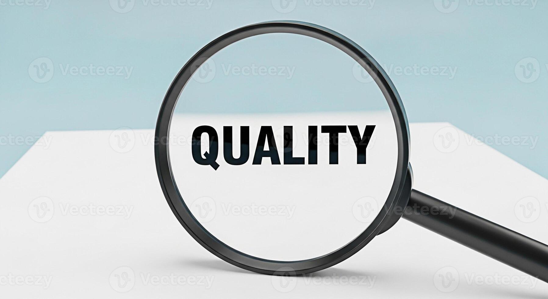 Magnifying glass inspecting the word QUALITY on a white surface in a bright studio setting symbolizing attention to detail excellence and the importance of high standards in business and product devel Pro Photo