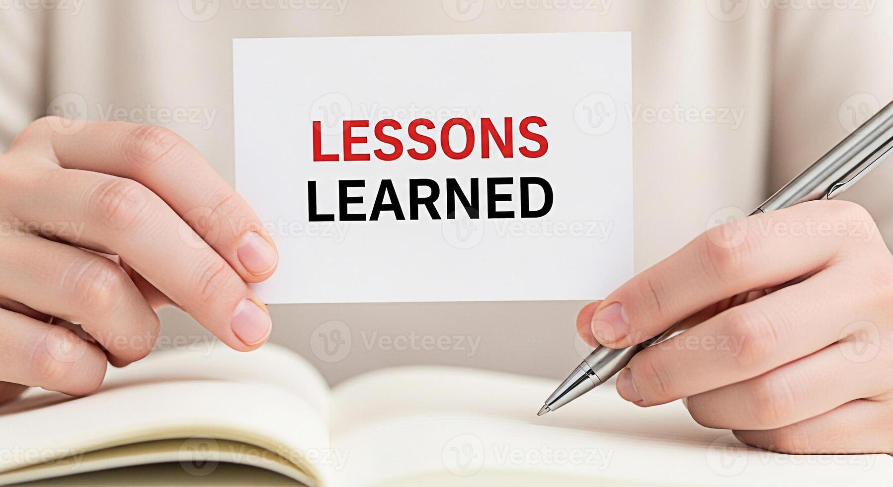 Closeup of hands holding a card with the words Lessons Learned while taking notes in a notebook with a pen in a bright neutraltoned setting emphasizing the concept of reflection and continuous improve Pro Photo