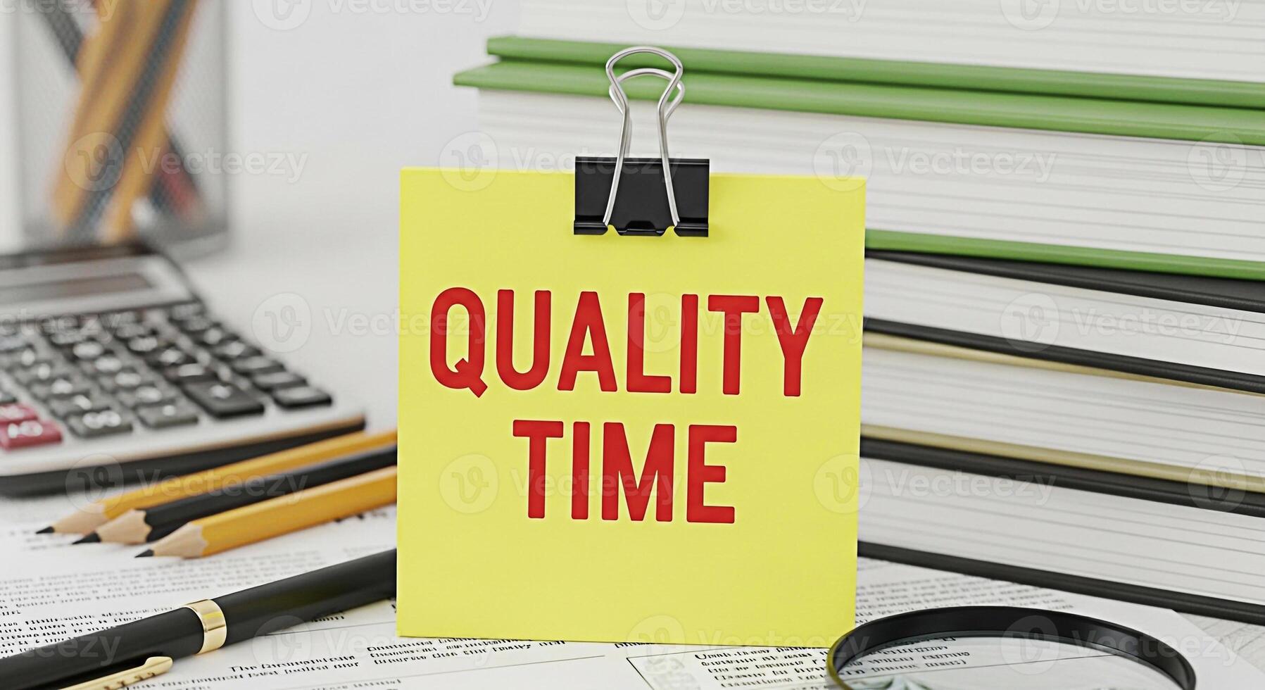 Yellow sticky note displaying Quality Time on a cluttered office desk with a calculator pencils pen magnifying glass and stacked books symbolizing the importance of focused and meaningful work session Pro Photo
