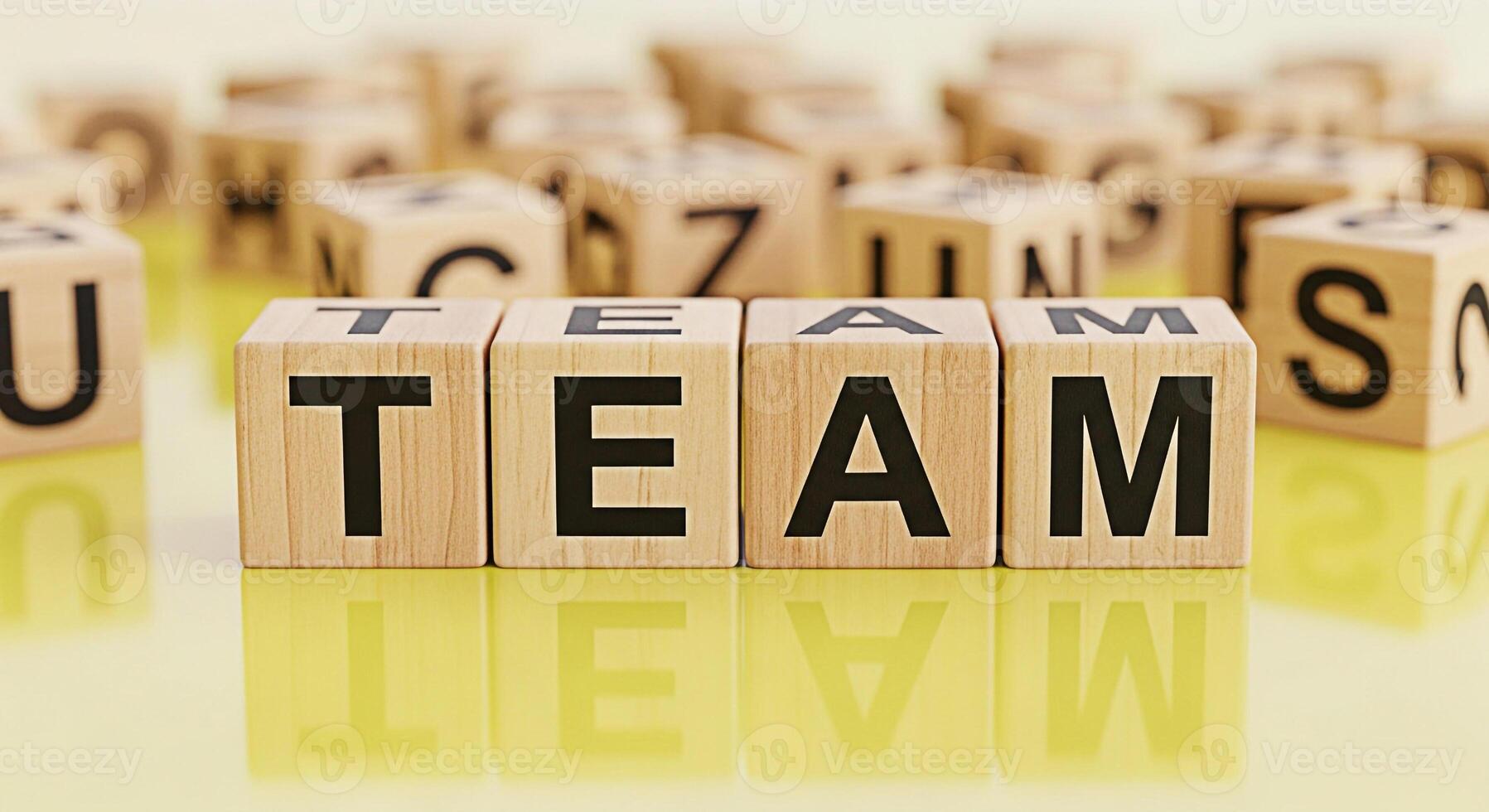 Wooden blocks spelling TEAM on a reflective yellow surface surrounded by other lettered blocks symbolizing collaboration unity and the importance of teamwork in achieving common goals in a bright envi Pro Photo