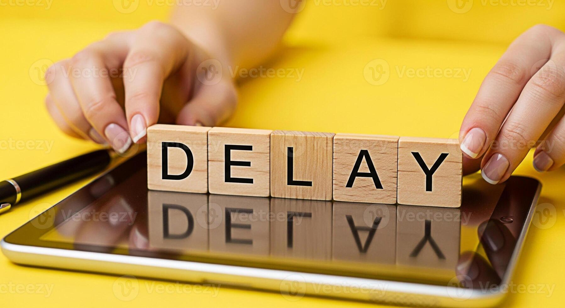 Female hands arranging wooden blocks spelling DELAY on a tablet in a bright yellow studio symbolizing project postponement and the challenge of managing timelines with a sense of urgency and control Pro Photo