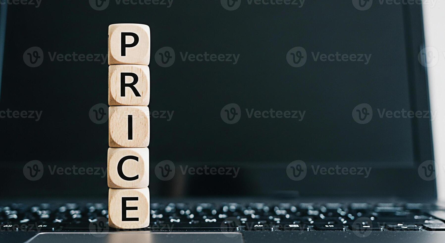 Wooden blocks spelling PRICE stacked on a laptop keyboard representing online shopping and ecommerce suggesting affordability and value in a digital marketplace with a focus on competitive pricing str Pro Photo
