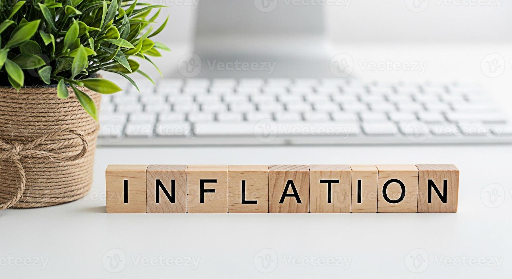 Wooden blocks spelling INFLATION on a white desk with a potted plant and computer keyboard in the background representing economic challenges and financial uncertainty in a modern workspace Pro Photo