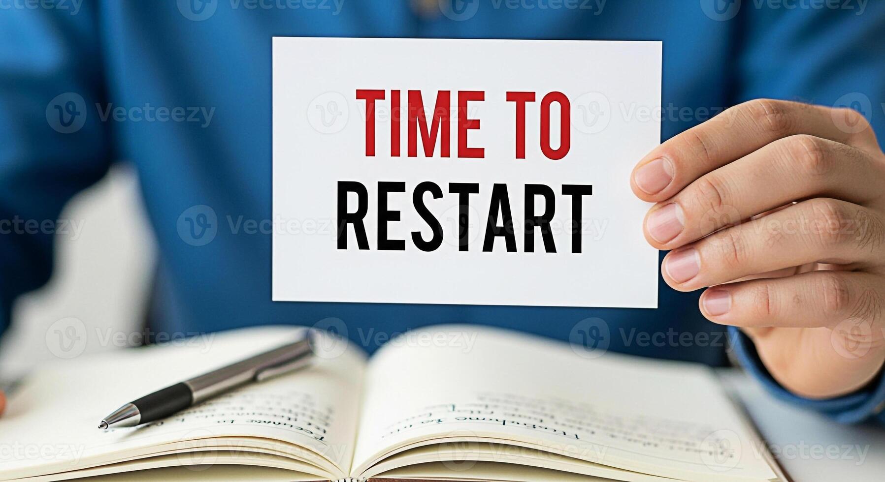 Man holding a card with the text Time to Restart above an open notebook and pen symbolizing a fresh start and new beginnings in a learning or business environment conveying a message of motivation and Pro Photo
