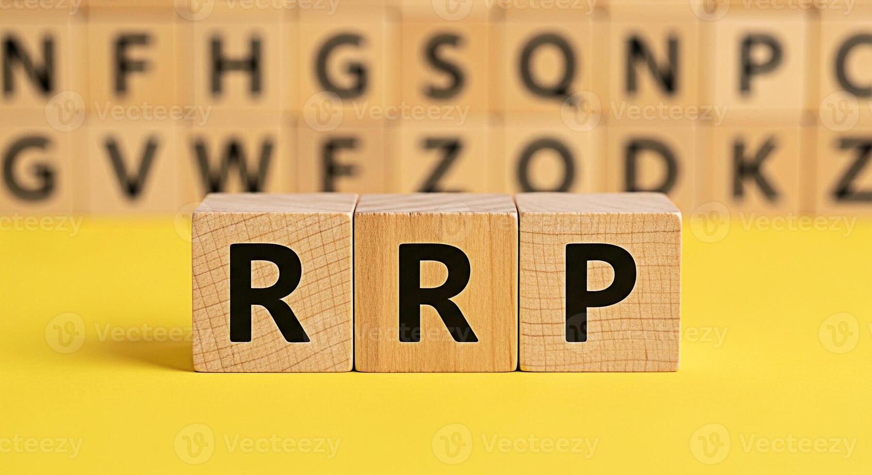 Wooden blocks displaying RRP on a vibrant yellow surface set against a backdrop of blurred alphabet blocks symbolizing retail price strategy and creating a focused educational atmosphere Pro Photo