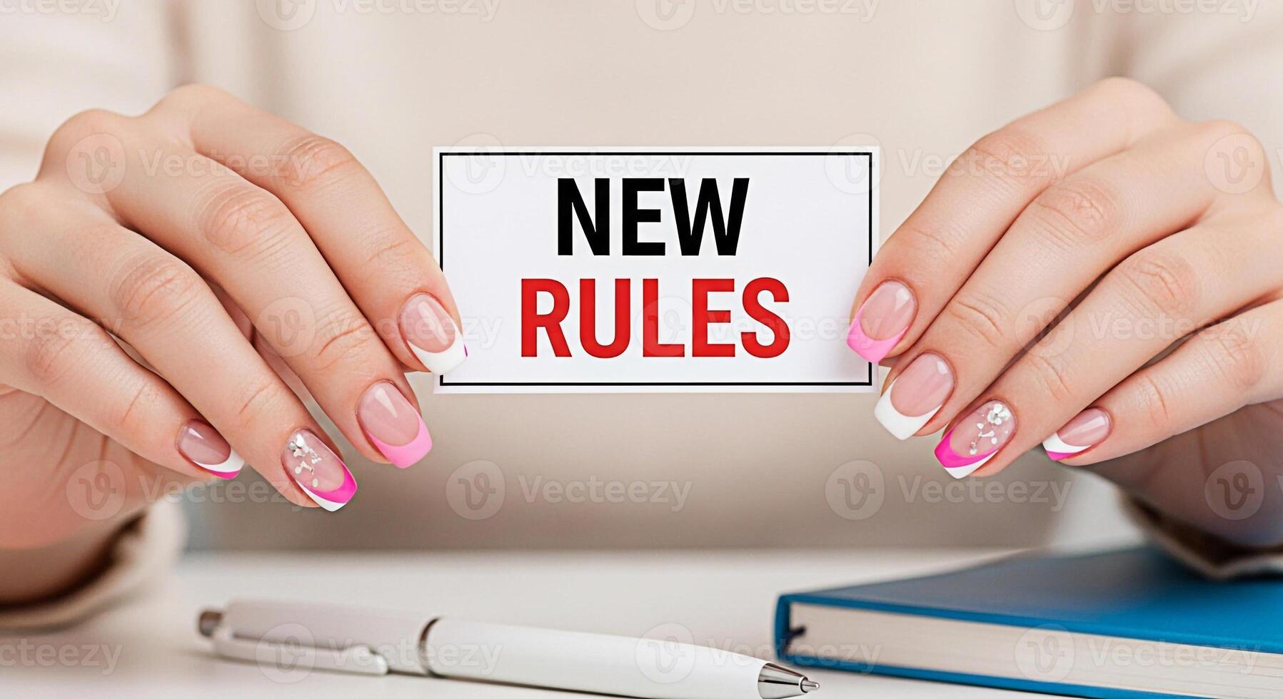 Womans manicured hands holding a sign with the words New Rules in a bright clean office environment symbolizing change policy updates and a fresh start with a focus on modern business practices Pro Photo