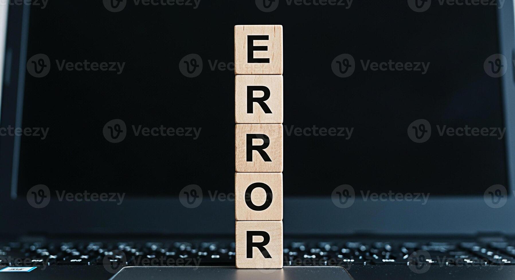 Wooden blocks spelling ERROR stand on a laptop keyboard symbolizing a system failure software bug or technical problem in a modern digital environment creating a sense of frustration and urgency Pro Photo