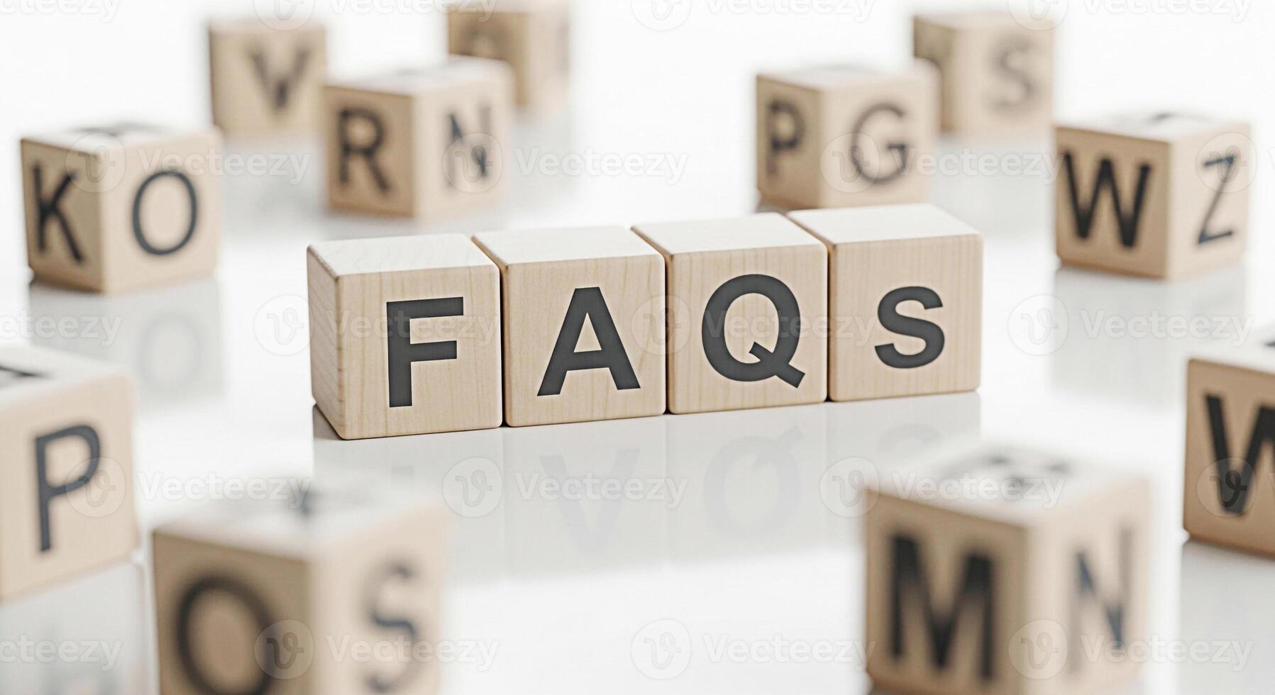Wooden blocks spelling FAQs on a white reflective surface surrounded by other lettered blocks representing frequently asked questions and information resources in a clear and accessible manner Pro Photo