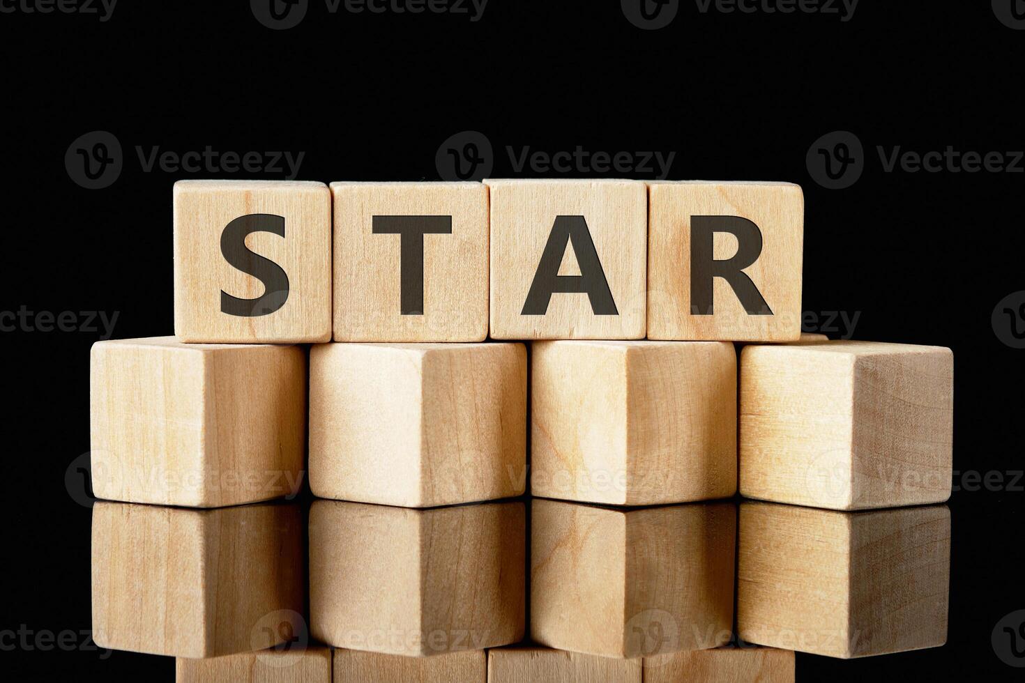 Wooden blocks arranged to form the word star sit on a reflective surface, creating an eye-catching visual against a dark background, emphasizing simplicity Pro Photo