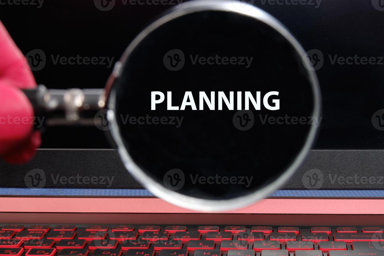 A person uses a magnifying glass to clearly view the word planning on a laptop screen. The glowing keys and dark background create a focused workspace atmosphere Pro Photo
