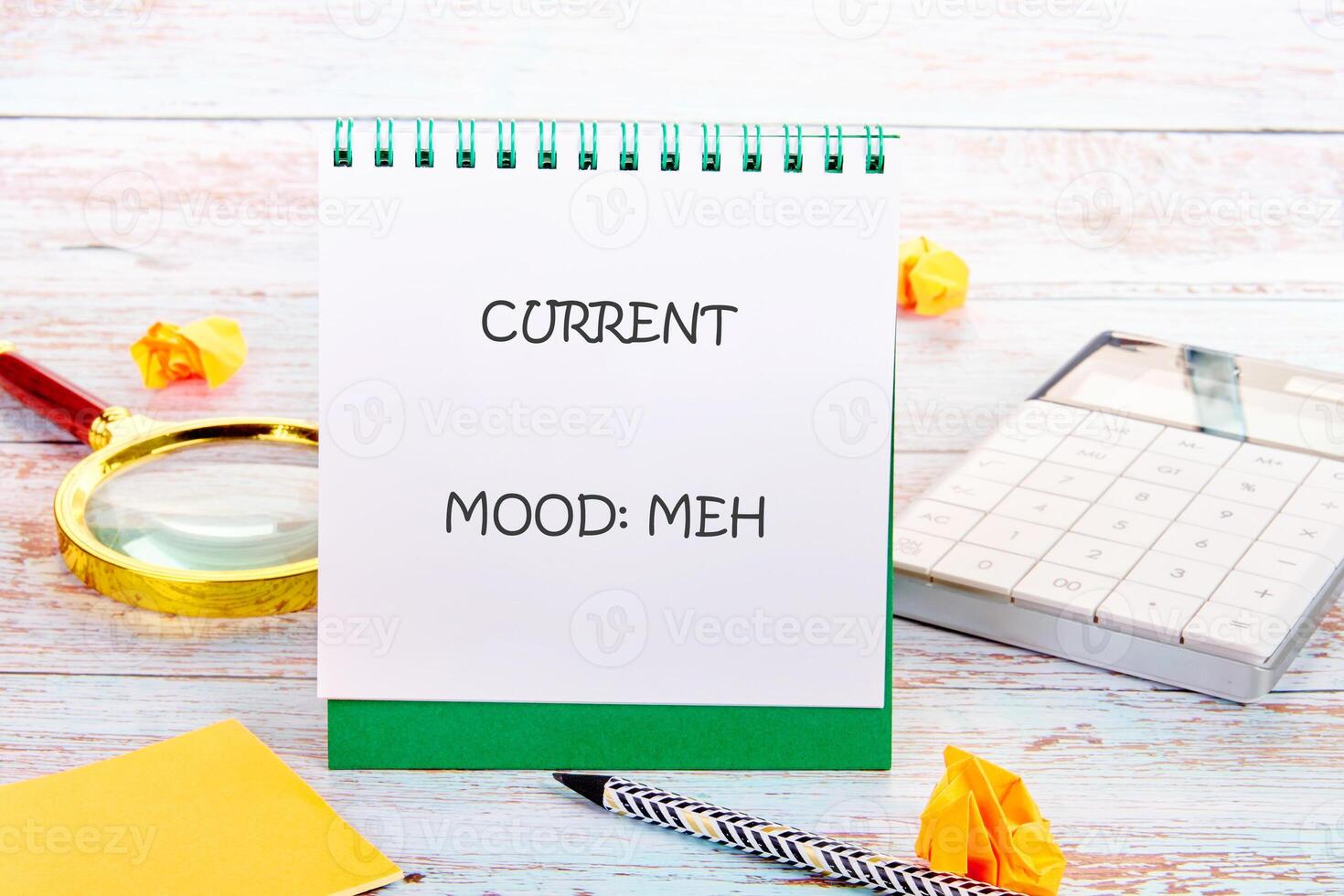 A notepad displays the words current mood meh as paper crumples lay around. A calculator and magnifying glass hint at daily tasks, evoking a sense of monotony and routine Pro Photo