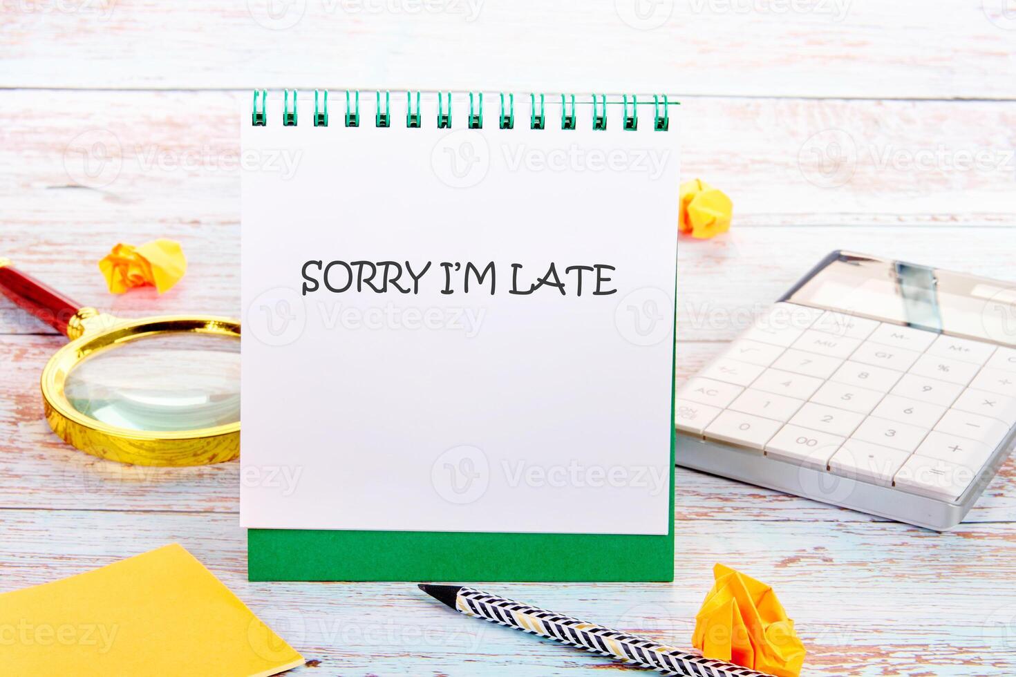 A desk displays a spiral notepad reading Sorry Im Late. A calculator, pen, magnifying glass, sticky note, and crumpled paper add to the scene, suggesting a busy day Pro Photo
