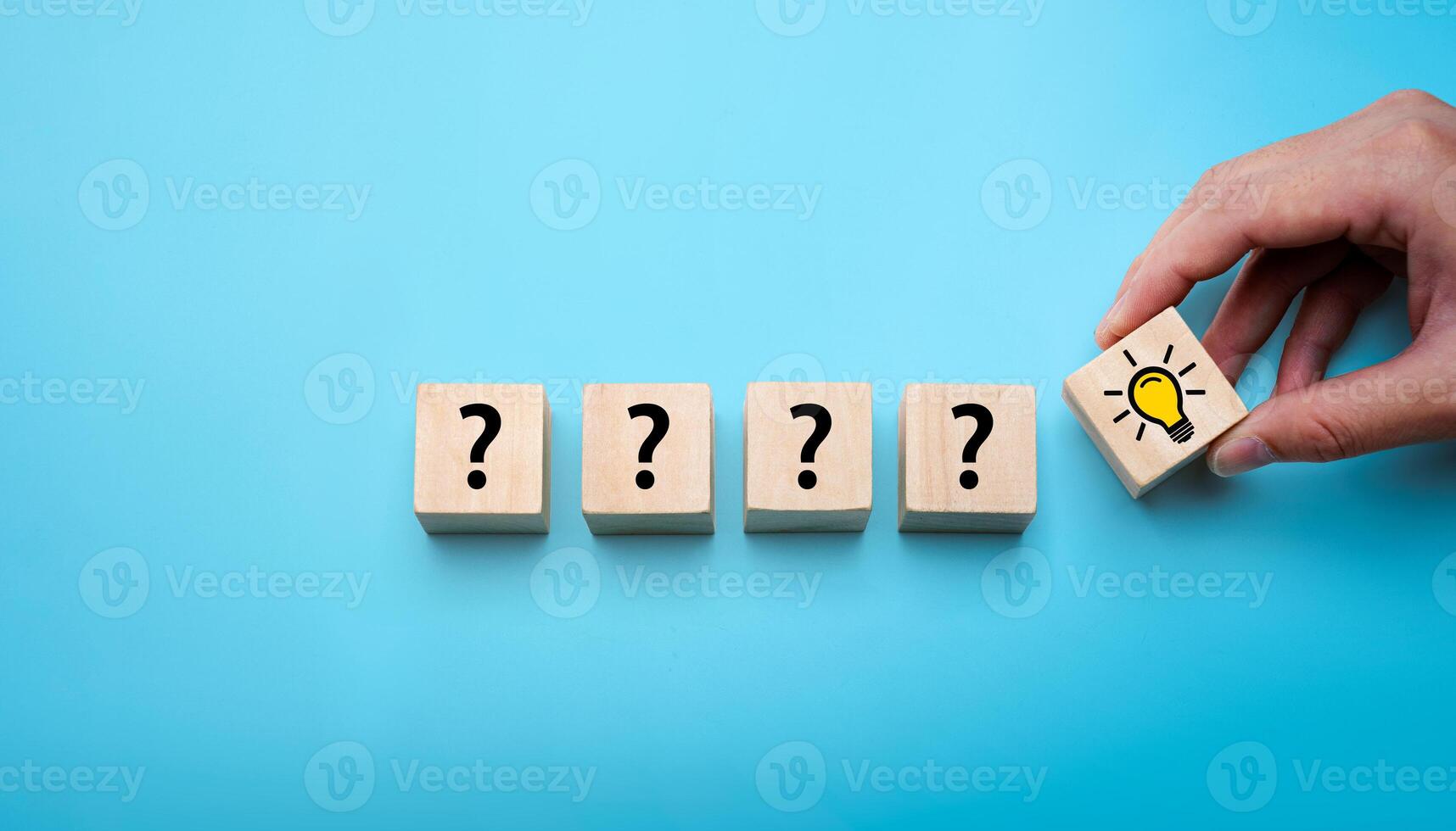 Creative problem solving concept with hand arranging wooden blocks showing question marks and light bulb icon, symbolizing idea generation, innovation, and finding solutions to challenges Pro Photo