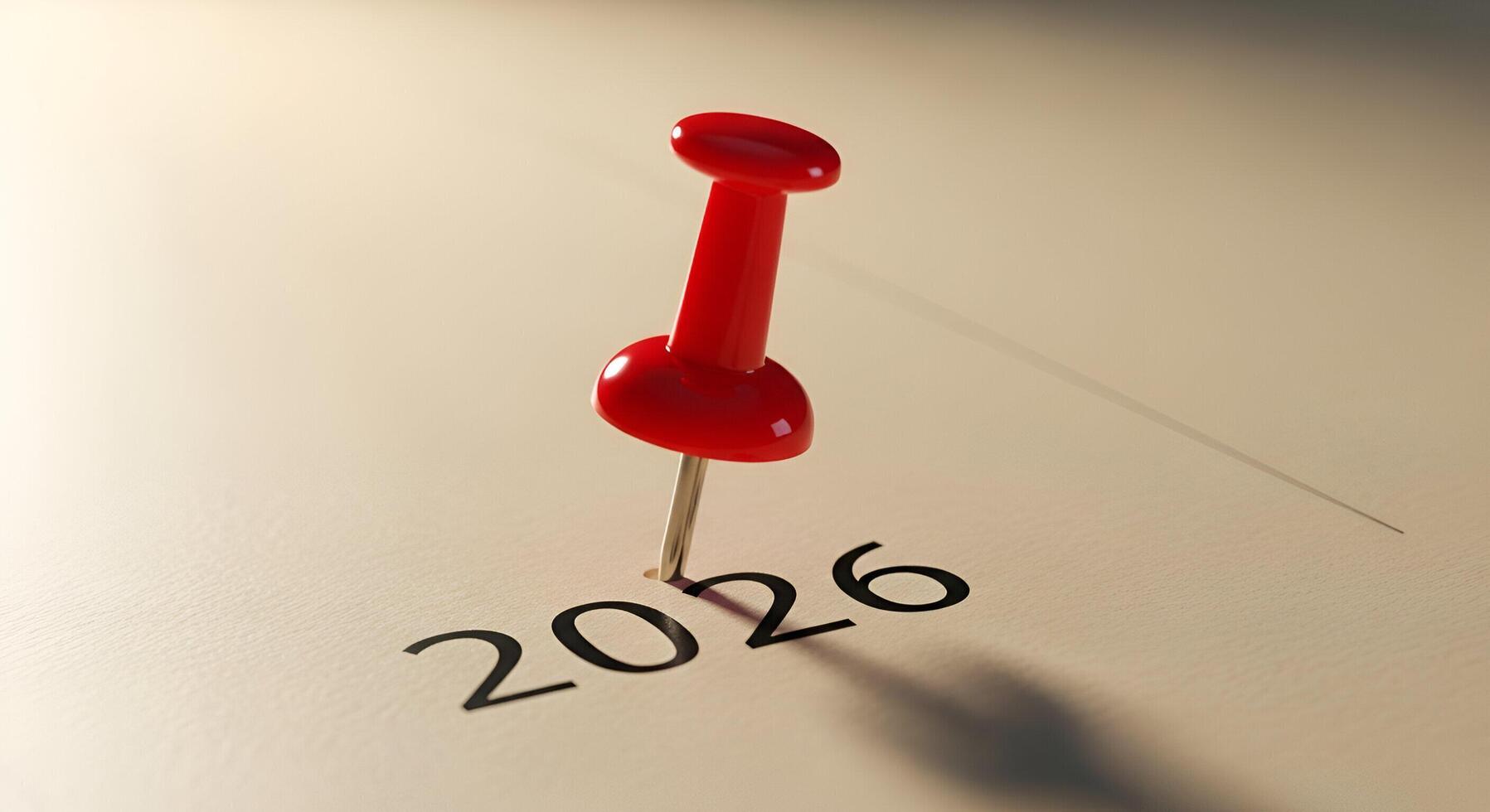 Conceptual image of a red push pin highlighting the year 2026, symbolizing preparation for the future. Free Photo