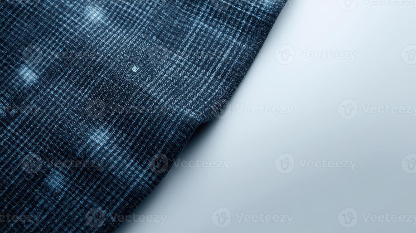 Close up shot of a dark blue patterned fabric with subtle white dots placed diagonally on a plain white background presenting a minimalist design. Pro Photo