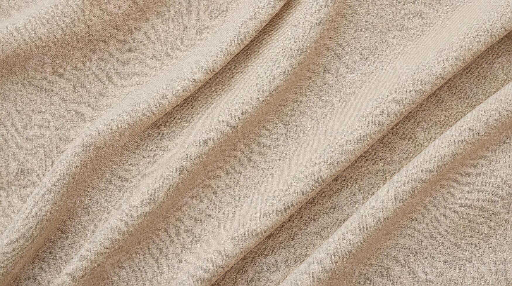 The soft beige fabric drapes elegantly with gentle folds creating a subtle texture and warm neutral background for fashion or design projects. Pro Photo