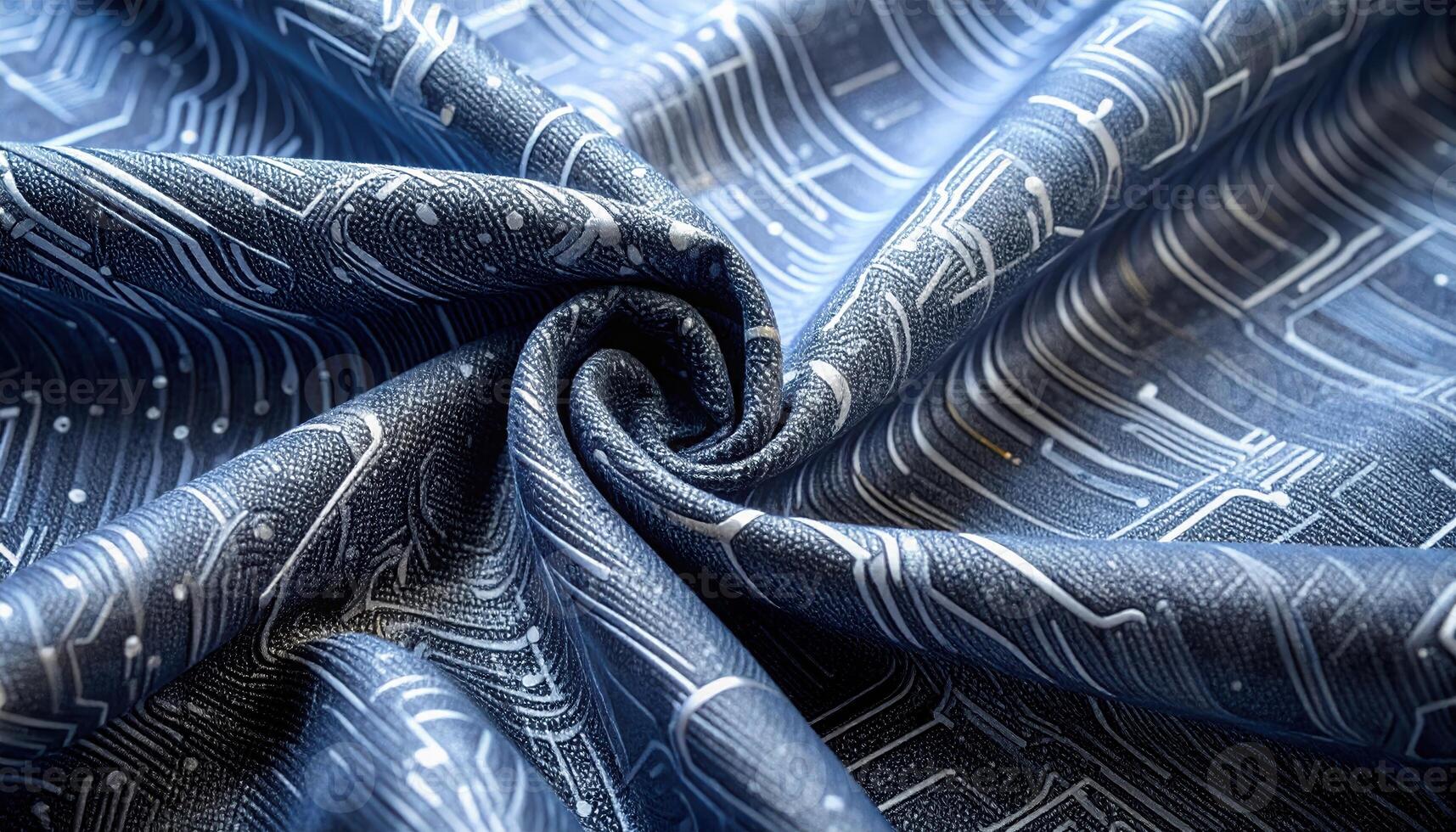 Close-up of folded blue fabric with a digital circuit board pattern, creating an abstract and technological inspired textile design. Pro Photo