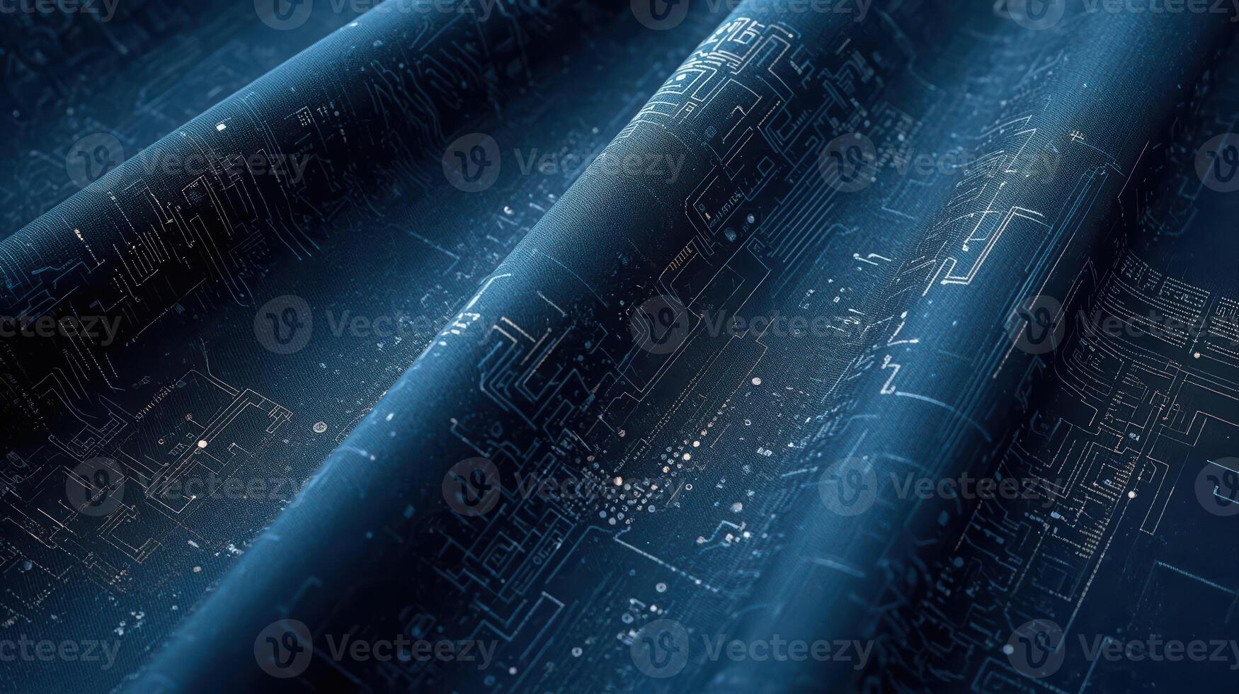 An abstract blue circuit board pattern folds like soft fabric with lines and connectors creating a digital technological textile design. Pro Photo