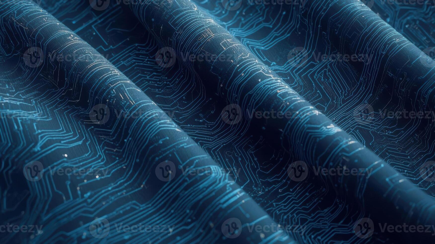 Detailed close up of a sophisticated dark blue printed circuit board design on rippled fabric creating an abstract tech background aesthetic. Pro Photo